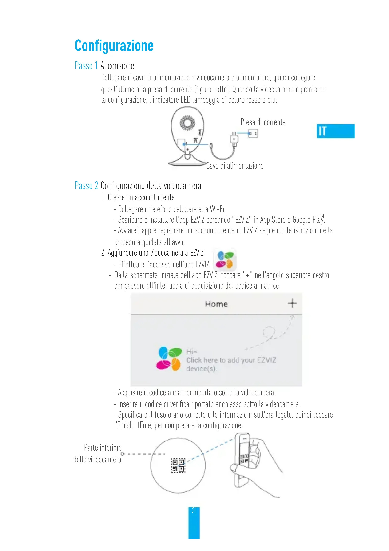 - Effettuare l'accesso nell'app EZVIZ. - Dalla schermata iniziale dell'app EZVIZ, toccare "+" nell'angolo superiore destro per passare all'interfaccia di acquisizione del codice a matrice. - Acquisire il codice a matrice riportato sotto la videocamera. - Inserire il codice di verifica riportato anch'esso sotto la videocamera. - Specificare il fuso orario corretto e le informazioni sull'ora legale, quindi toccare "Finish" (Fine) per completare la configurazione. Presa di corrente Cavo di alimentazione Parte inferiore della videocamera22