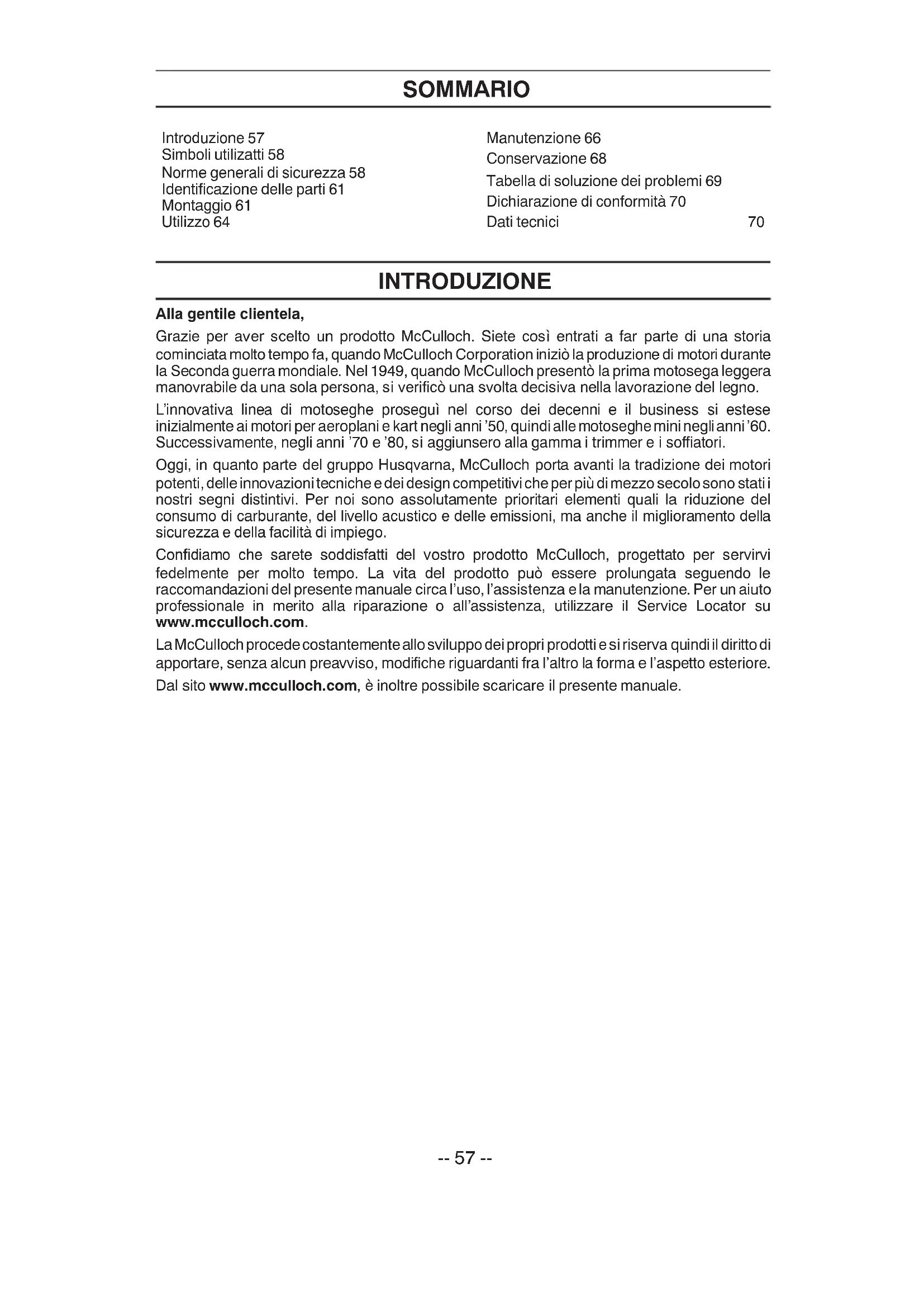 .-- 57 -- SOMMARIO Introduzione 57 Simboli utilizatti 58 Norme generali di sicurezza 58 Identificazione delle parti 61 Montaggio 61 Utilizzo 64 Manutenzione 66 Conservazione 68 Tabella di soluzione dei problemi 69 Dichiarazione di conformità 70 Dati tecnici 70 INTRODUZIONE Alla gentile clientela, Grazie per aver scelto un prodotto McCulloch. Siete così entrati a far parte di una storia cominciata molto tempo fa, quandoMcCulloch Corporationiniziò laproduzione di motori durante la Seconda guerra mondiale. Nel 1949, quando McCulloch presentò la prima motosega leggera manovrabile da una sola persona, si verificò una svolta decisiva nella lavorazione del legno. L’innovativa linea di motoseghe proseguì nel corso dei decenni e il business si estese inizialmente ai motori per aeroplaniekart negli anni ’50, quindiallemotoseghe mininegli anni’60. Successivamente, negli anni ’70 e ’80, si aggiunsero alla gamma i trimmer e i soffiatori. Oggi, in quanto parte del gruppo Husqvarna, McCulloch porta avanti la tradizione dei motori potenti,delleinnovazionitecnicheedeidesigncompetitivi che per piùdimezzo secolosono statii nostri segni distintivi. Per noi sono assolutamente prioritari elementi quali la riduzione del consumo di carburante, del livello acustico e delle emissioni, ma anche il miglioramento della sicurezza e della facilità di impiego. Confidiamo che sarete soddisfatti del vostro prodotto McCulloch, progettato per servirvi fedelmente per molto tempo. La vita del prodotto può essere prolungata seguendo le raccomandazioni del presente manuale circa l’uso, l’assistenza ela manutenzione. Per un aiuto professionale in merito alla riparazione o all’assistenza, utilizzare il Service Locator su www.mcculloch.com. LaMcCulloch procedecostantementeallosviluppodeipropri prodottie si riserva quindiil dirittodi apportare, senza alcun preavviso, modifiche riguardanti fra l’altro la forma e l’aspetto esteriore. Dal sito www.mcculloch.com, è inoltre possibile scaricare il presente manuale.-- 58 -- SIMBOLI UTILIZATTI Usate la vostra unità come aspiratoreper aspirare materiale asciutto quale,foglie, erba, piccoli ramoscelli, e pezzi dicarta. Non utilizzare l’unità come unvuoto per aspirare pietre, ghiaia, metallo,vetro rotto, e simili, al fine di evitaregravi danni le pale in rotazione.Usare occhiali o visiera diprotezione, cuffie auricolari, emascherina in presenza dipolvere.L’utilizzatore della macchina deveaccertarsi che durante il lavoro nessuno siavvicini in un raggio di 15 metri.Quando nella stessa area vengonoutilizzate più macchine, occorre rispettareuna distanza di sicurezza di almeno 15metri.AVVERTENZA! La silenziatore si surriscalda durante e dopo l’uso. Non toccare la silenziatore, la sua protezione o le superficicircostanti, e assicurarsi che nessuna di queste parti entri in contatto con materiali infiammabili come erba secca e carburante.Utilizzare sempre guantiprotettivi omologati.Istruzioni di apertura delcopertura della presa d’ariadell’aspiratore. Inclinaredelicatamente l’impugnaturadel cacciavite verso la parteanteriore dell’apparecchioper sganciare il gancio,tirando con l’altra mano ilcopertura di entratadell’aspiratore.AVVERTENZA! Il soffiatorepuò essere pericoloso! L’usoincauto o errato puòprovocare lesioni gravi omortali Leggere ed essere certi diaver capito bene le istruzionidel libretto prima di usare ilsoffiatore AVVERTENZA! Accertarsi che ilcopertura inferiore sia ben fissatoo che il tubo aspiratore siacorrettamente installato. Nontoccare la pala della ventola conla mano o con oggetti.Livello di pressioneacustica a 7,5 metriLivello dipotenzaacusticaUtilizzare benzina verde o benzinasuper di qualità e olio per motore adue tempi.AVVERTENZA! La spazzafoglie puòurtare violentemente oggetti che possonorimbalzare, causando seri danni agliocchi.