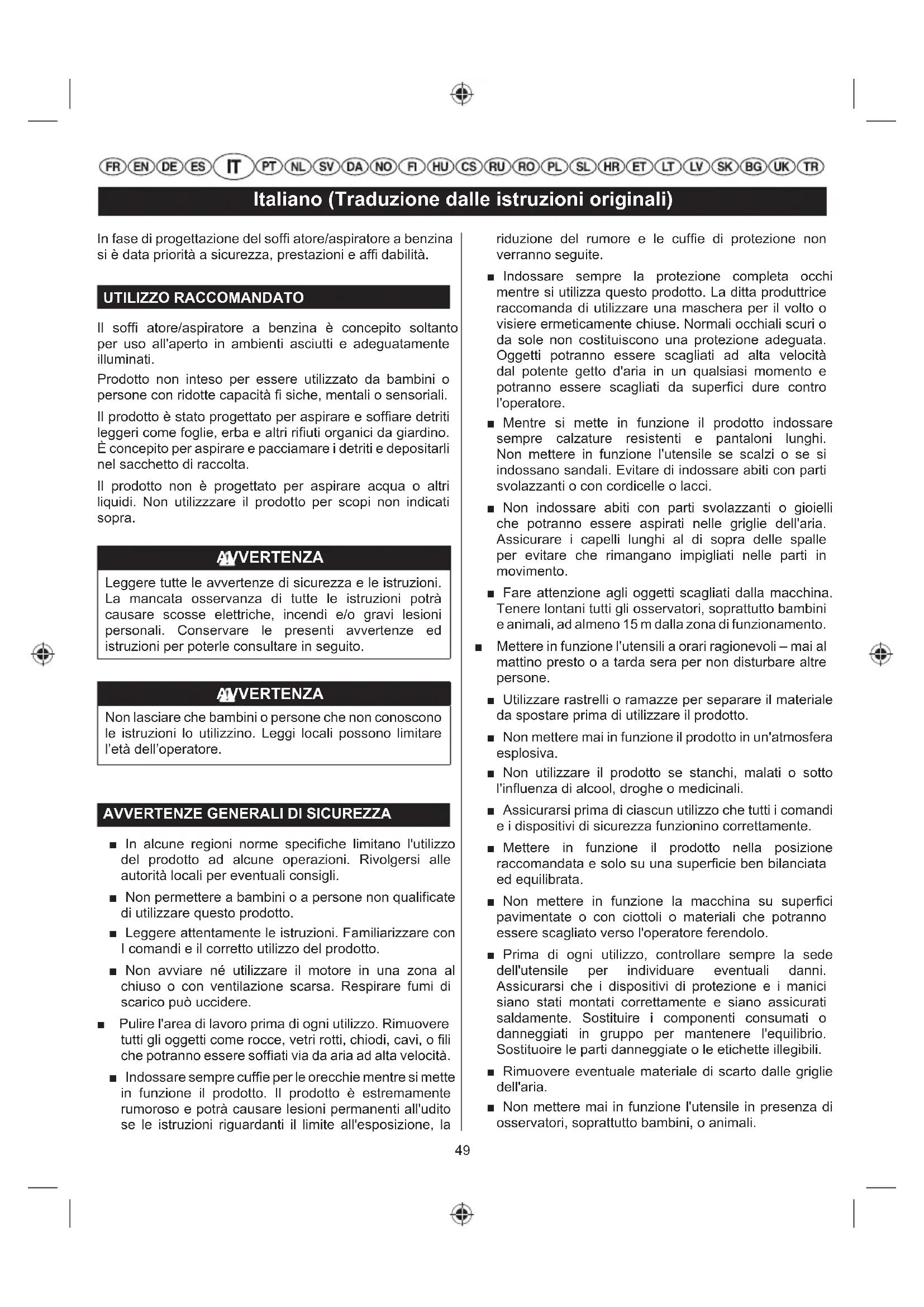 NOTAS: ■ Se debe realizar un mantenimiento más frecuente cuando se utilice el producto en zonas con polvo. ■ Cuando el producto ha superado el máximo establecido en la tabla, el mantenimiento debería realizarse cíclicamente conforme a los intervalos de tiempo y horas establecidos aquí.49 Italiano (Traduzione dalle istruzioni originali) In fase di progettazione del soffi atore/aspiratore a benzina si è data priorità a sicurezza, prestazioni e affi dabilità. UTILIZZO RACCOMANDATO Il soffi atore/aspiratore a benzina è concepito soltanto per uso all'aperto in ambienti asciutti e adeguatamente illuminati. Prodotto non inteso per essere utilizzato da bambini o persone con ridotte capacità fi siche, mentali o sensoriali. Il prodotto è stato progettato per aspirare e soffi are detriti leggeri come foglie, erba e altri rifi uti organici da giardino. È concepito per aspirare e pacciamare i detriti e depositarli nel sacchetto di raccolta. Il prodotto non è progettato per aspirare acqua o altri liquidi. Non utilizzzare il prodotto per scopi non indicati sopra. AVVERTENZA Leggere tutte le avvertenze di sicurezza e le istruzioni. La mancata osservanza di tutte le istruzioni potrà causare scosse elettriche, incendi e/o gravi lesioni personali. Conservare le presenti avvertenze ed istruzioni per poterle consultare in seguito. AVVERTENZA Non lasciare che bambini o persone che non conoscono le istruzioni lo utilizzino. Leggi locali possono limitare l’età dell’operatore.