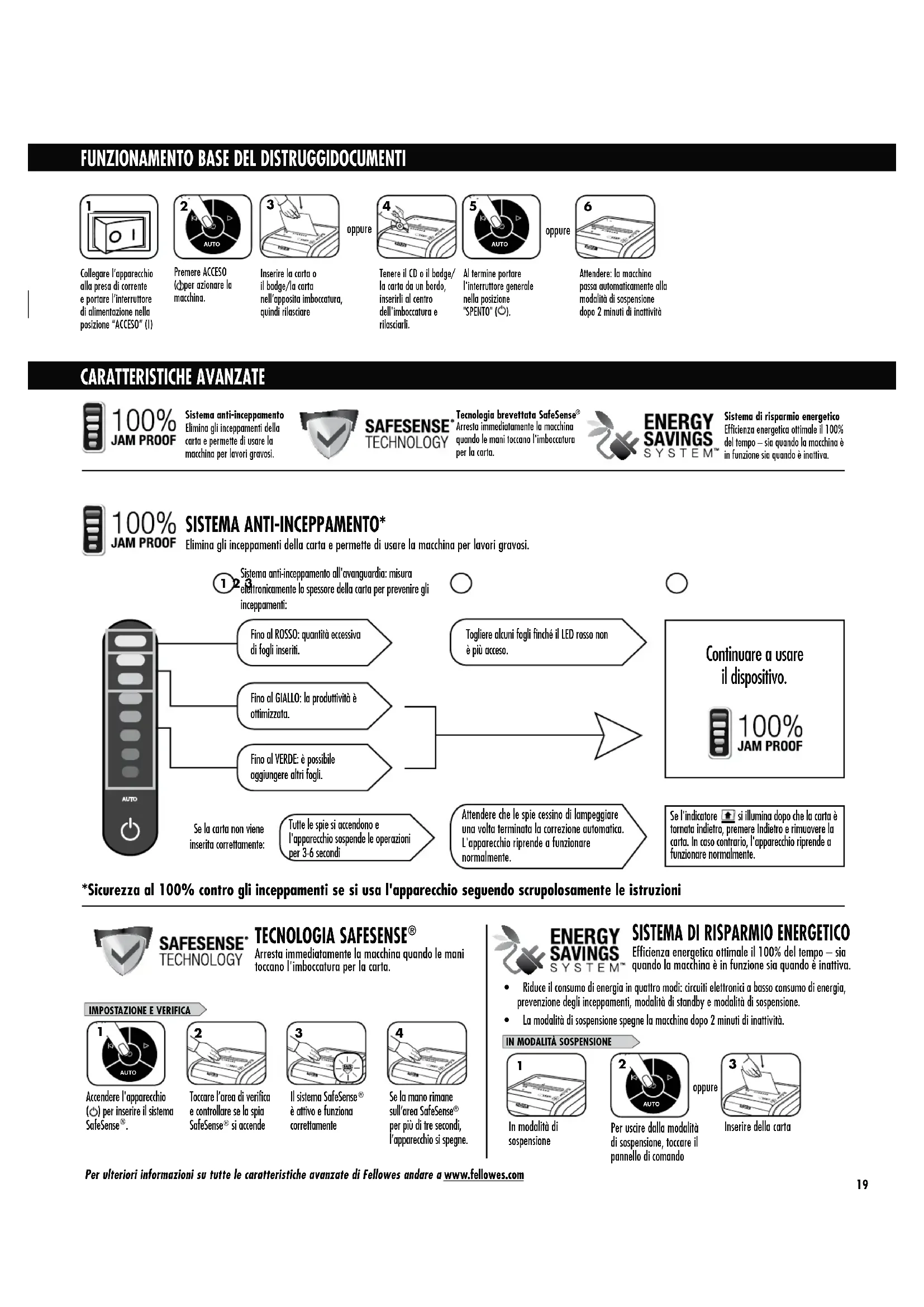 per più di tre secondi, l’apparecchio si spegne. t 3JEVDFJMDPOTVNPEJFOFSHJBJORVBUUSPNPEJDJSDVJUJFMFUUSPOJDJBCBTTPDPOTVNPEJFOFSHJB prevenzione degli inceppamenti, modalità di standby e modalità di sospensione. t -BNPEBMJUËEJTPTQFOTJPOFTQFHOFMBNBDDIJOBEPQPøNJOVUJEJJOBUUJWJUË Per ulteriori informazioni su tutte le caratteristiche avanzate di Fellowes andare a www.fellowes.com
