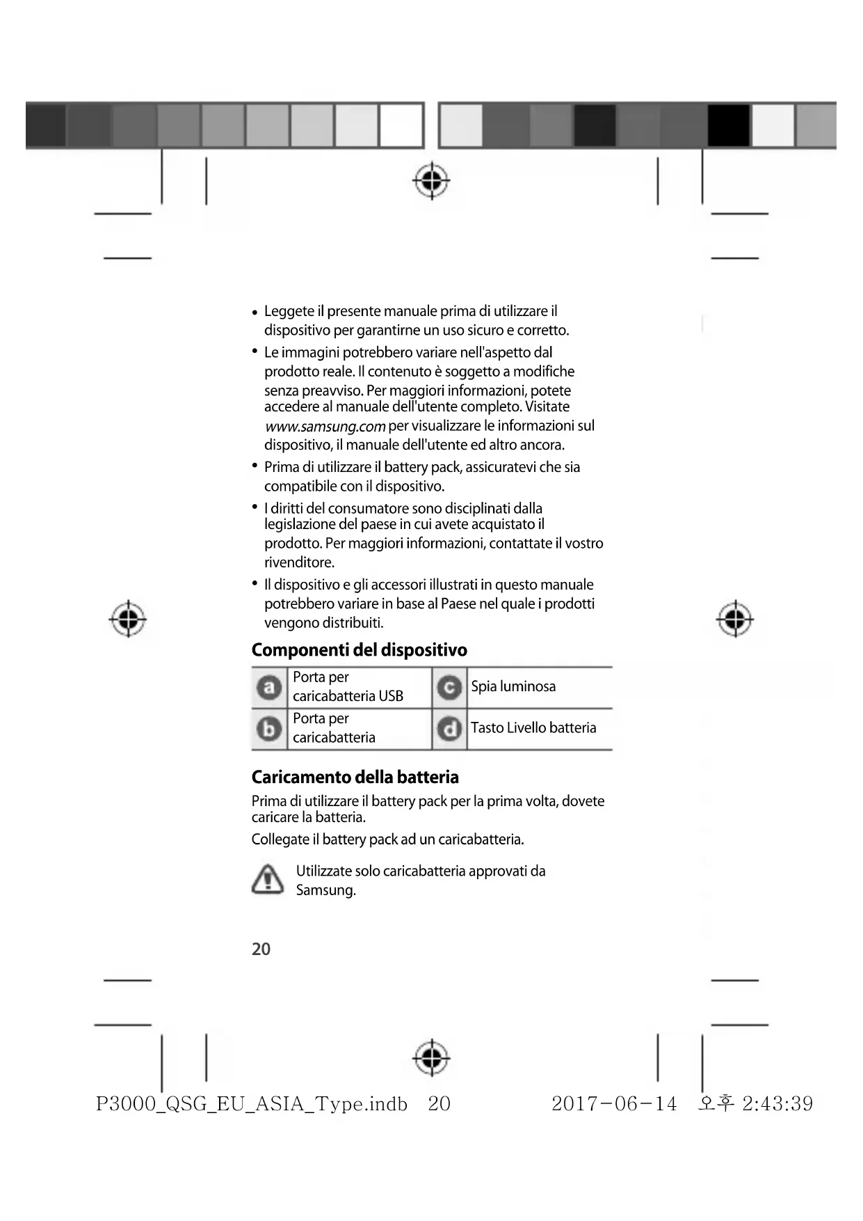 Il dispositivo e gli accessori illustrati in questo manuale potrebbero variare in base al Paese nel quale i prodotti vengono distribuiti. Componenti del dispositivo Porta per caricabatteria USB Spia luminosa Porta per caricabatteria Tasto Livello batteria Caricamento della batteria Prima di utilizzare il battery pack per la prima volta, dovete caricare la batteria. Collegate il battery pack ad un caricabatteria. Utilizzate solo caricabatteria approvati da Samsung. Italiano P3000_QSG_EU_ASIA_Type.indb 20P3000_QSG_EU_ASIA_Type.indb 20 2017-06-14 오후 2:43:392017-06-14 오후 2:43:3921 Italiano