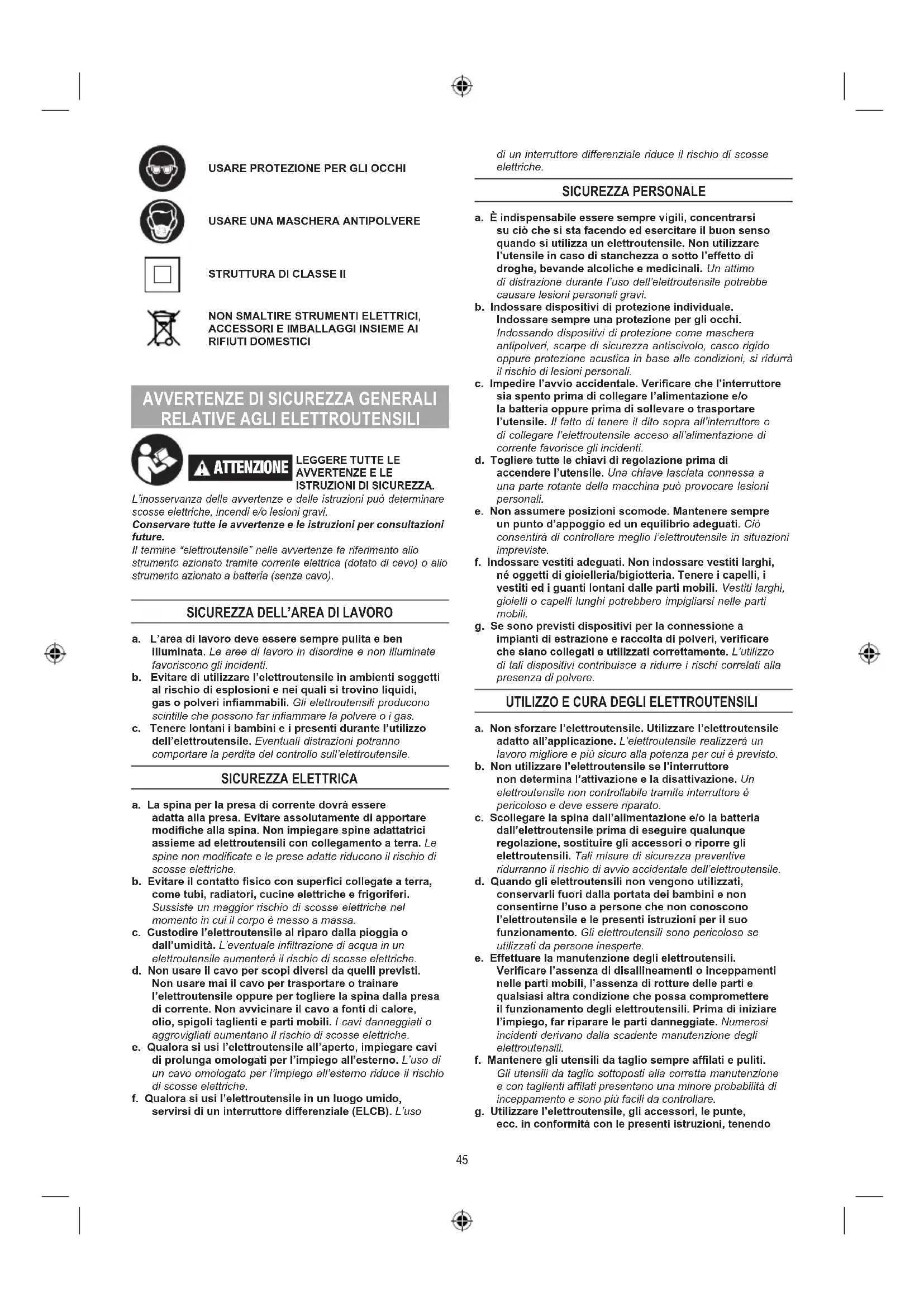 a. L’area di lavoro deve essere sempre pulita e ben illuminata. Le aree di lavoro in disordine e non illuminate favoriscono gli incidenti. b. Evitare di utilizzare l’elettroutensile in ambienti soggetti al rischio di esplosioni e nei quali si trovino liquidi, gas o polveri inammabili. Gli elettroutensili producono scintille che possono far inammare la polvere o i gas. c. Tenere lontani i bambini e i presenti durante l’utilizzo dell’elettroutensile. Eventuali distrazioni potranno comportare la perdita del controllo sull’elettroutensile. SICUREZZA ELETTRICA a. La spina per la presa di corrente dovrà essere adatta alla presa. Evitare assolutamente di apportare modiche alla spina. Non impiegare spine adattatrici assieme ad elettroutensili con collegamento a terra. Le spine non modicate e le prese adatte riducono il rischio di scosse elettriche. b. Evitare il contatto sico con superci collegate a terra, come tubi, radiatori, cucine elettriche e frigoriferi. Sussiste un maggior rischio di scosse elettriche nel momento in cui il corpo è messo a massa. c. Custodire l’elettroutensile al riparo dalla pioggia o dall’umidità. L’eventuale inltrazione di acqua in un elettroutensile aumenterà il rischio di scosse elettriche. d. Non usare il cavo per scopi diversi da quelli previsti. Non usare mai il cavo per trasportare o trainare l’elettroutensile oppure per togliere la spina dalla presa di corrente. Non avvicinare il cavo a fonti di calore, olio, spigoli taglienti e parti mobili. I cavi danneggiati o aggrovigliati aumentano il rischio di scosse elettriche. e. Qualora si usi l’elettroutensile all’aperto, impiegare cavi di prolunga omologati per l’impiego all’esterno. L’uso di un cavo omologato per l’impiego all’esterno riduce il rischio di scosse elettriche. f. Qualora si usi l’elettroutensile in un luogo umido, servirsi di un interruttore differenziale (ELCB). L’uso NETTOYAGE
