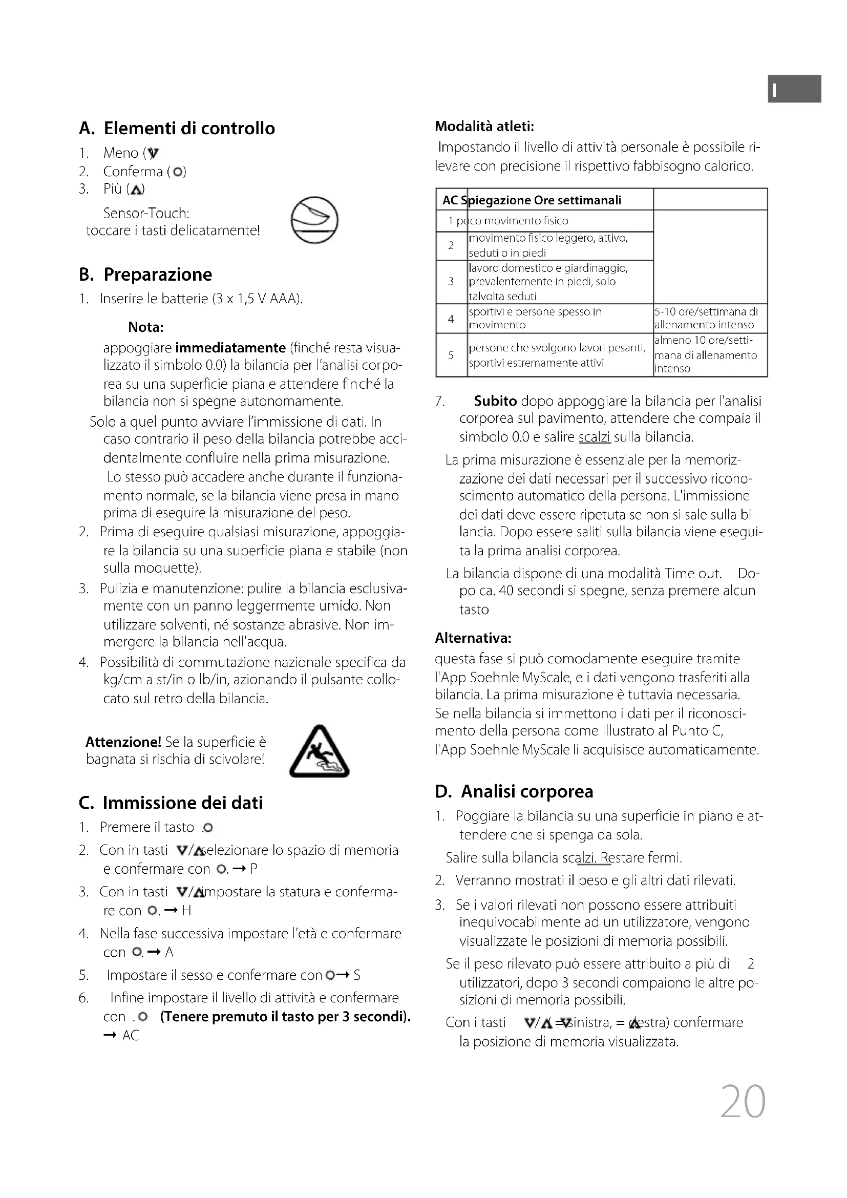 kg/cm a st/in o lb/in, azionando il pulsante collo- cato sul retro della bilancia. Attenzione! Se la superficie è bagnata si rischia di scivolare! C. Immissione dei dati