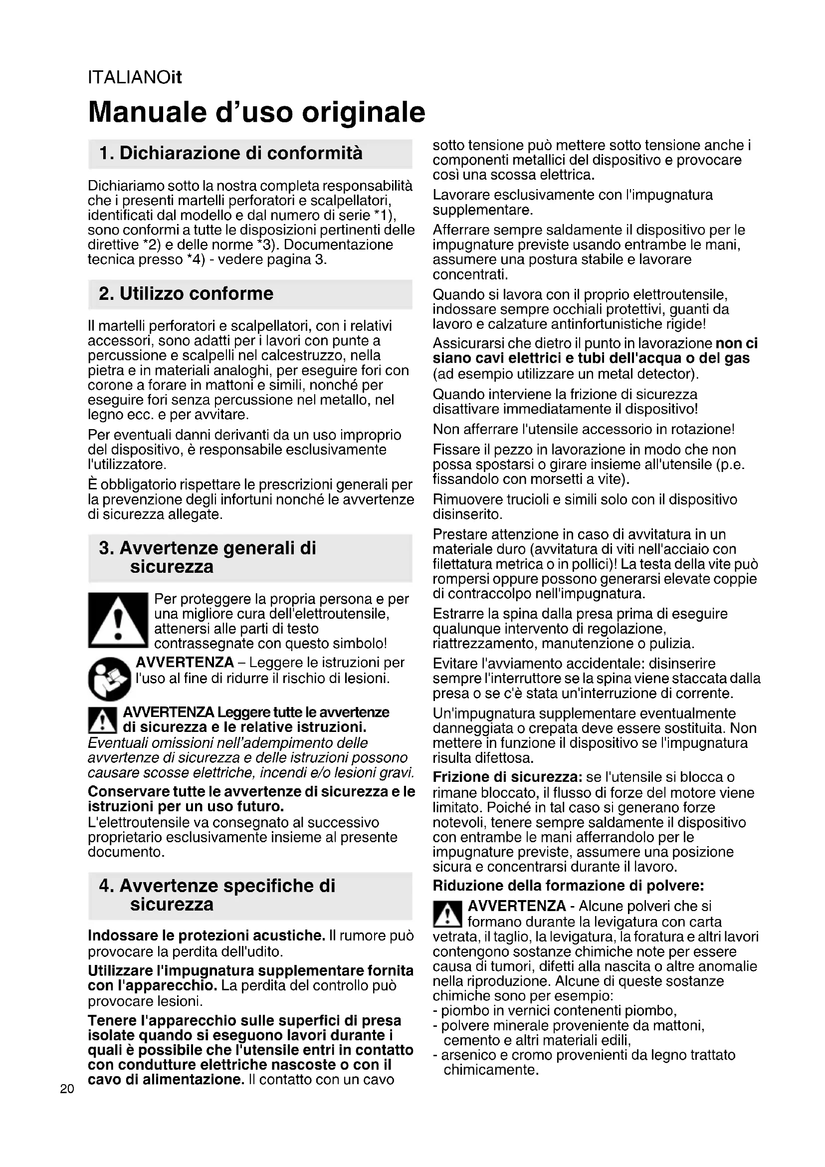 Dichiariamo sotto la nostra completa responsabilità che i presenti martelli perforatori e scalpellatori, identificati dal modello e dal numero di serie *1), sono conformi a tutte le disposizioni pertinenti delle direttive *2) e delle norme *3). Documentazione tecnica presso *4) - vedere pagina 3. Il martelli perforatori e scalpellatori, con i relativi accessori, sono adatti per i lavori con punte a percussione e scalpelli nel calcestruzzo, nella pietra e in materiali analoghi, per eseguire fori con corone a forare in mattoni e simili, nonché per eseguire fori senza percussione nel metallo, nel legno ecc. e per avvitare. Per eventuali danni derivanti da un uso improprio del dispositivo, è responsabile esclusivamente l'utilizzatore. È obbligatorio rispettare le prescrizioni generali per la prevenzione degli infortuni nonché le avvertenze di sicurezza allegate. Per proteggere la propria persona e per una migliore cura dell'elettroutensile, attenersi alle parti di testo contrassegnate con questo simbolo! AVVERTENZA – Leggere le istruzioni per l'uso al fine di ridurre il rischio di lesioni. AVVERTENZA Leggere tutte le avvertenze di sicurezza e le relative istruzioni. Eventuali omissioni nell’adempimento delle avvertenze di sicurezza e delle istruzioni possono causare scosse elettriche, incendi e/o lesioni gravi. Conservare tutte le avvertenze di sicurezza e le istruzioni per un uso futuro. L'elettroutensile va consegnato al successivo proprietario esclusivamente insieme al presente documento. Indossare le protezioni acustiche. Il rumore può provocare la perdita dell'udito. Utilizzare l'impugnatura supplementare fornita con l'apparecchio. La perdita del controllo può provocare lesioni. Tenere l'apparecchio sulle superfici di presa isolate quando si eseguono lavori durante i quali è possibile che l'utensile entri in contatto con condutture elettriche nascoste o con il cavo di alimentazione. Il contatto con un cavo sotto tensione può mettere sotto tensione anche i componenti metallici del dispositivo e provocare così una scossa elettrica. Lavorare esclusivamente con l'impugnatura supplementare. Afferrare sempre saldamente il dispositivo per le impugnature previste usando entrambe le mani, assumere una postura stabile e lavorare concentrati. Quando si lavora con il proprio elettroutensile, indossare sempre occhiali protettivi, guanti da lavoro e calzature antinfortunistiche rigide! Assicurarsi che dietro il punto in lavorazione non ci siano cavi elettrici e tubi dell'acqua o del gas (ad esempio utilizzare un metal detector). Quando interviene la frizione di sicurezza disattivare immediatamente il dispositivo! Non afferrare l'utensile accessorio in rotazione! Fissare il pezzo in lavorazione in modo che non possa spostarsi o girare insieme all'utensile (p.e. fissandolo con morsetti a vite). Rimuovere trucioli e simili solo con il dispositivo disinserito. Prestare attenzione in caso di avvitatura in un materiale duro (avvitatura di viti nell'acciaio con filettatura metrica o in pollici)! La testa della vite può rompersi oppure possono generarsi elevate coppie di contraccolpo nell'impugnatura. Estrarre la spina dalla presa prima di eseguire qualunque intervento di regolazione, riattrezzamento, manutenzione o pulizia. Evitare l'avviamento accidentale: disinserire sempre l'interruttore se la spina viene staccata dalla presa o se c'è stata un'interruzione di corrente. Un'impugnatura supplementare eventualmente danneggiata o crepata deve essere sostituita. Non mettere in funzione il dispositivo se l'impugnatura risulta difettosa. Frizione di sicurezza: se l'utensile si blocca o rimane bloccato, il flusso di forze del motore viene limitato. Poiché in tal caso si generano forze notevoli, tenere sempre saldamente il dispositivo con entrambe le mani afferrandolo per le impugnature previste, assumere una posizione sicura e concentrarsi durante il lavoro. Riduzione della formazione di polvere: AVVERTENZA - Alcune polveri che si formano durante la levigatura con carta vetrata, il taglio, la levigatura, la foratura e altri lavori contengono sostanze chimiche note per essere causa di tumori, difetti alla nascita o altre anomalie nella riproduzione. Alcune di queste sostanze chimiche sono per esempio: - piombo in vernici contenenti piombo, - polvere minerale proveniente da mattoni, cemento e altri materiali edili, - arsenico e cromo provenienti da legno trattato chimicamente. Manuale d’uso originale