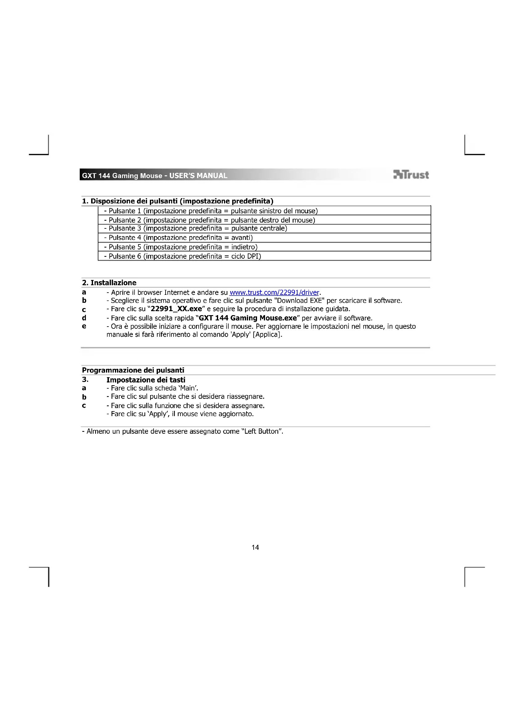 Scarica le istruzioni per il tuo Mouse in formato PDF gratuitamente! Trova il tuo manuale Rexx GXT 144 - TRUST e riprendi in mano il tuo dispositivo elettronico. In questa pagina sono pubblicati tutti i documenti necessari per l'utilizzo del tuo dispositivo. Rexx GXT 144 del marchio TRUST.