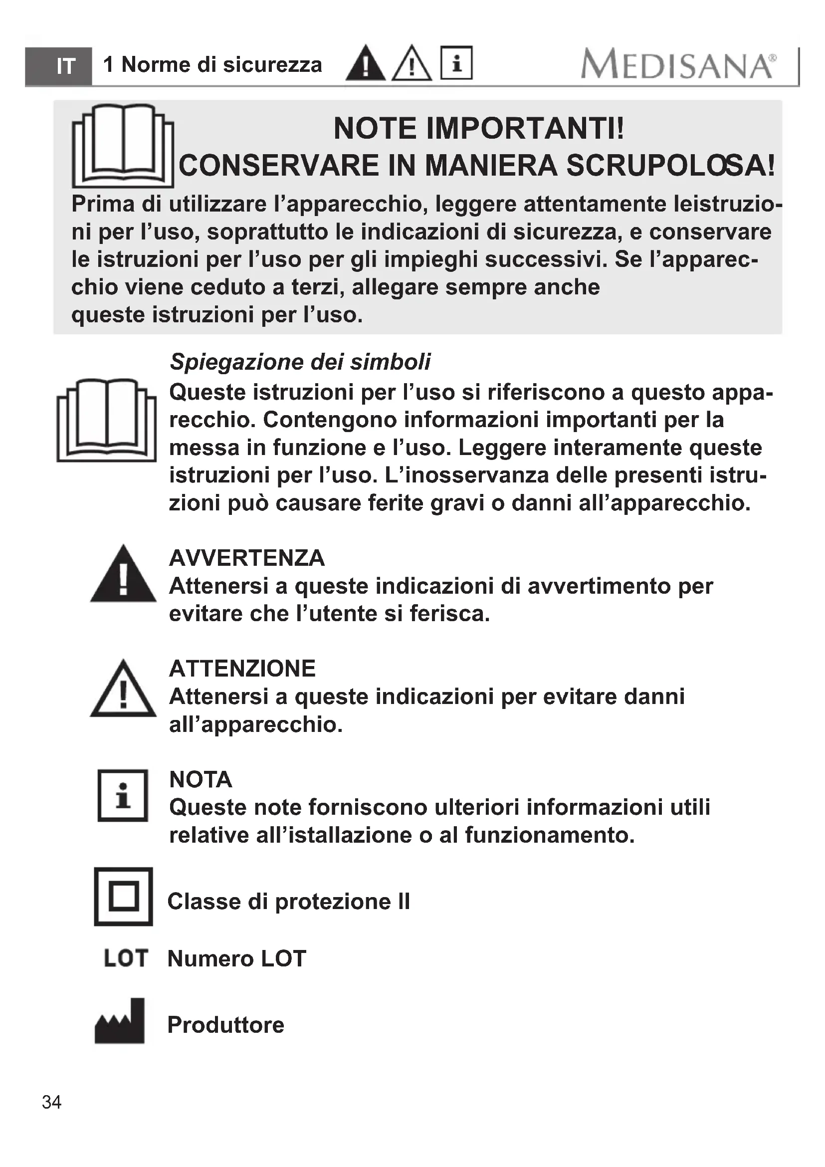 SA! Prima di utilizzare l’apparecchio, leggere attentamente leistruzio- ni per l’uso, soprattutto le indicazioni di sicurezza, e conservare le istruzioni per l’uso per gli impieghi successivi. Se l’apparec- chio viene ceduto a terzi, allegare sempre anche queste istruzioni per l’uso. Spiegazione dei simboli Queste istruzioni per l’uso si riferiscono a questo appa- recchio. Contengono informazioni importanti per la messa in funzione e l’uso. Leggere interamente queste istruzioni per l’uso. L’inosservanza delle presenti istru- zioni può causare ferite gravi o danni all’apparecchio. AVVERTENZA Attenersi a queste indicazioni di avvertimento per evitare che l’utente si ferisca. ATTENZIONE Attenersi a queste indicazioni per evitare danni all’apparecchio. NOTA Queste note forniscono ulteriori informazioni utili relative all’istallazione o al funzionamento. Numero LOT Produttore Classe di protezione II 1 Norme di sicurezza IT35 1 Norme di sicurezza