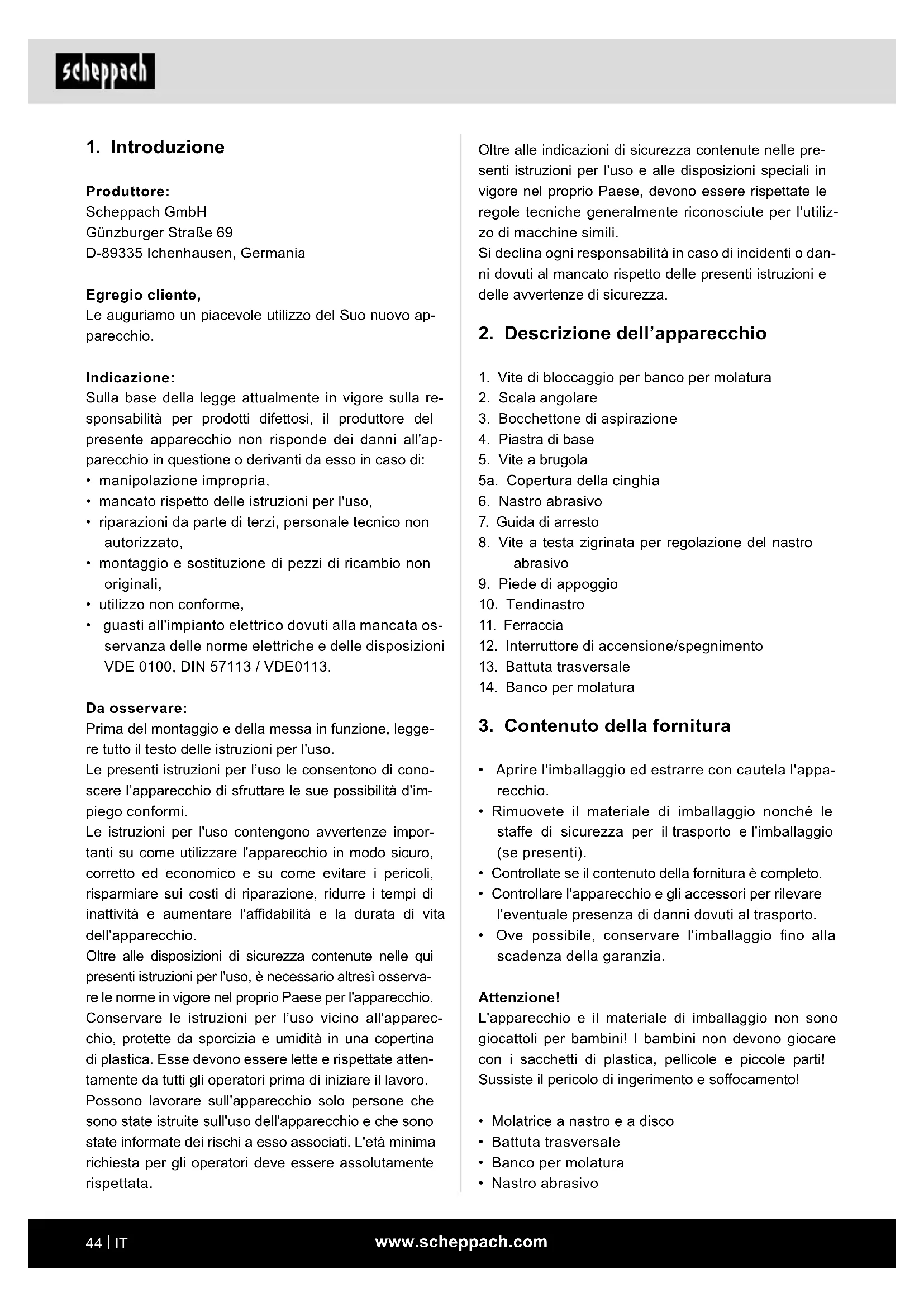 Produttore: Scheppach GmbH Günzburger Straße 69 D-89335 Ichenhausen, Germania Egregio cliente, Le auguriamo un piacevole utilizzo del Suo nuovo ap- parecchio. Indicazione: Sulla base della legge attualmente in vigore sulla re- sponsabilità per prodotti difettosi, il produttore del presente apparecchio non risponde dei danni all'ap- parecchio in questione o derivanti da esso in caso di: