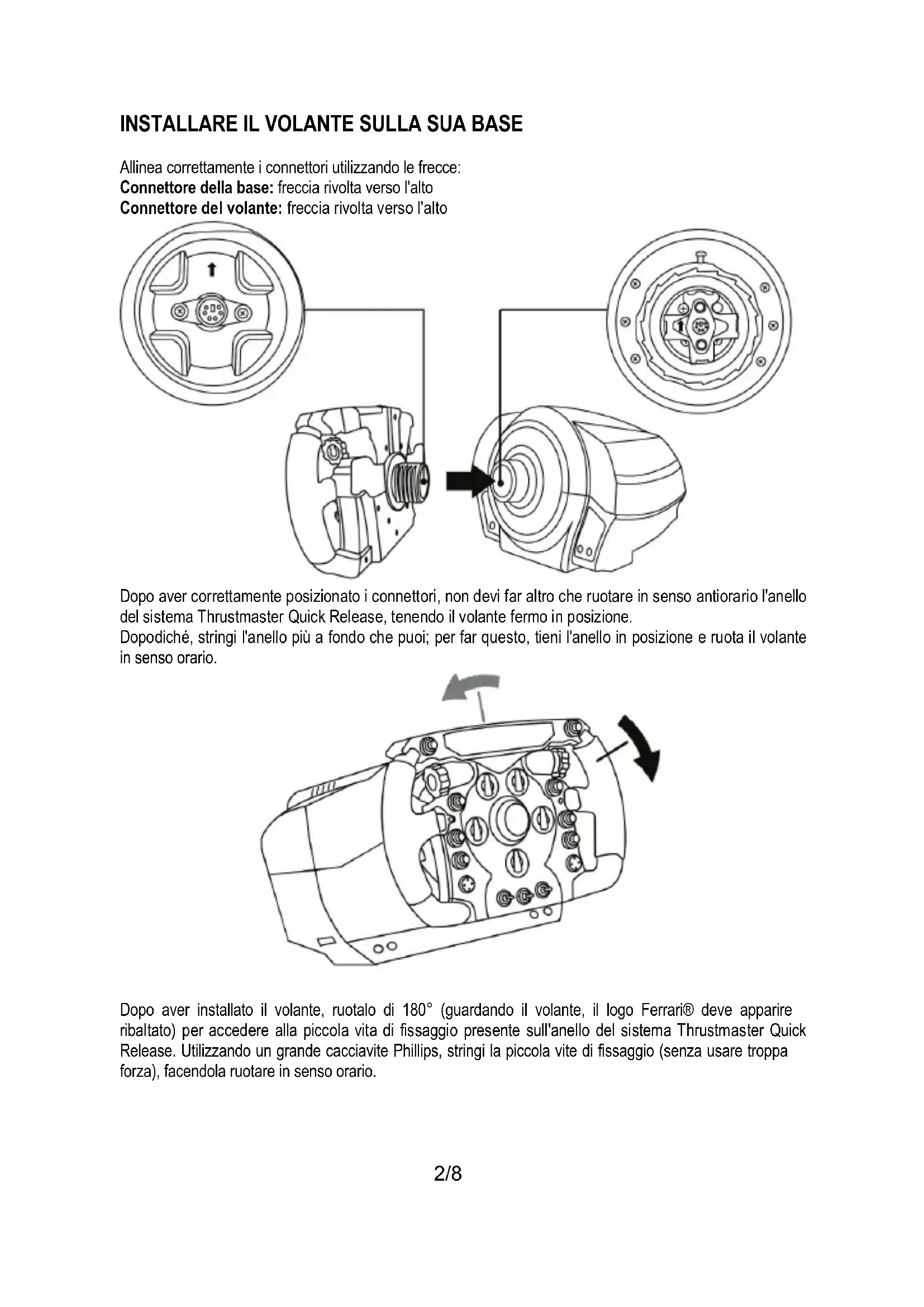 Allinea correttamente i connettori utilizzando le frecce: Connettore della base: freccia rivolta verso l'alto Connettore del volante: freccia rivolta verso l'alto Dopo aver correttamente posizionato i connettori, non devi far altro che ruotare in senso antiorario l'anello del sistema Thrustmaster Quick Release, tenendo il volante fermo in posizione. Dopodiché, stringi l'anello più a fondo che puoi; per far questo, tieni l'anello in posizione e ruota il volante in senso orario.