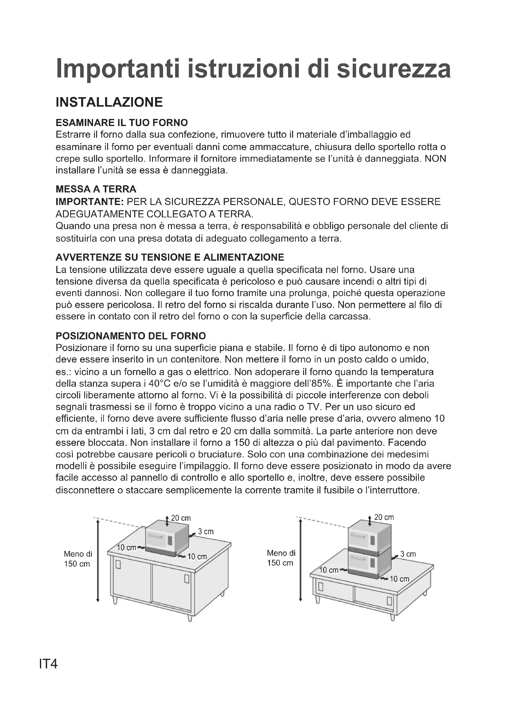 Posizionare il forno su una supercie piana e stabile. Il forno è di tipo autonomo e non deve essere inserito in un contenitore. Non mettere il forno in un posto caldo o umido, es.: vicino a un fornello a gas o elettrico. Non adoperare il forno quando la temperatura della stanza supera i 40°C e/o se l’umidità è maggiore dell’85%. È importante che l’aria circoli liberamente attorno al forno. Vi è la possibilità di piccole interferenze con deboli segnali trasmessi se il forno è troppo vicino a una radio o TV. Per un uso sicuro ed eciente, il forno deve avere suciente usso d’aria nelle prese d’aria, ovvero almeno 10 cm da entrambi i lati, 3 cm dal retro e 20 cm dalla sommità. La parte anteriore non deve essere bloccata. Non installare il forno a 150 di altezza o più dal pavimento. Facendo così potrebbe causare pericoli o bruciature. Solo con una combinazione dei medesimi modelli è possibile eseguire l’impilaggio. Il forno deve essere posizionato in modo da avere facile accesso al pannello di controllo e allo sportello e, inoltre, deve essere possibile disconnettere o staccare semplicemente la corrente tramite il fusibile o l’interruttore. Meno di 150 cmMeno di 150 cm