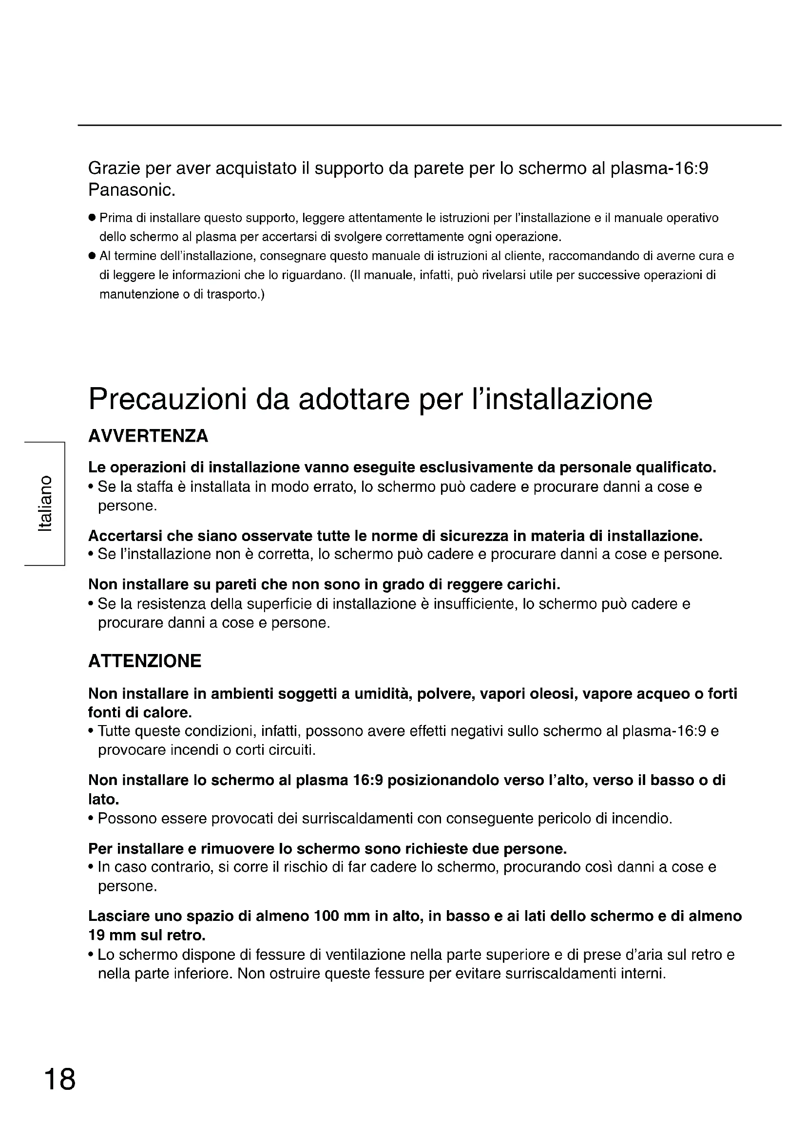 Prima di installare questo supporto, leggere attentamente le istruzioni per l’installazione e il manuale operativo dello schermo al plasma per accertarsi di svolgere correttamente ogni operazione.