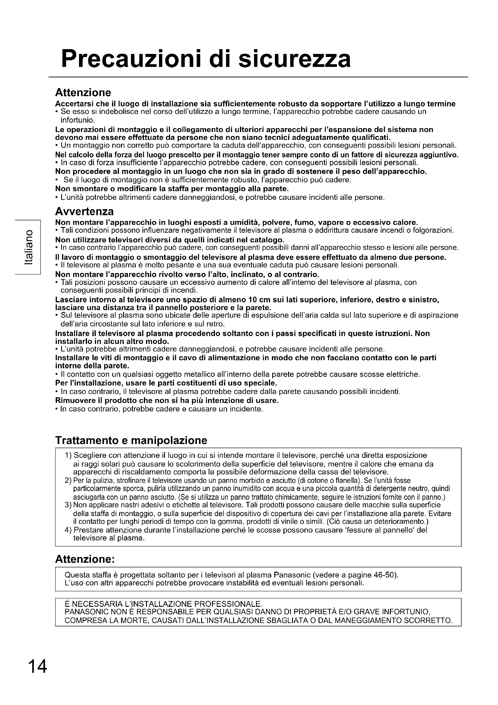 televisore al plasma. Attenzione: Questa staffa è progettata soltanto per i televisori al plasma Panasonic (vedere a pagine 46-50). L’uso con altri apparecchi potrebbe provocare instabilità ed eventuali lesioni personali. È NECESSARIA L’INSTALLAZIONE PROFESSIONALE. PANASONIC NON È RESPONSABILE PER QUALSIASI DANNO DI PROPRIETÀ E/O GRAVE INFORTUNIO, COMPRESA LA MORTE, CAUSATI DALL’INSTALLAZIONE SBAGLIATA O DAL MANEGGIAMENTO SCORRETTO. Precauzioni di sicurezza TY-WK42PR4WTQZH993-34048.indb14TY-WK42PR4WTQZH993-34048.indb14 2008/04/0711:56:392008/04/0711:56:3915 Italiano Parti [ Le immagini mostrate in questo manuale sono soltanto a scopo illustrativo.] TY-WK42PR4W Staffa di montaggio alla parete (con angolazione regolabile) ㇙ Staffa di montaggio alla parete (1) ㇜ Chiave esagonale (1) (attrezzo fornito)㇝ Viti per il fissaggio dell’apparecchio (2) M5x35 ㇚ Spaziatori isolanti (4) ㇛ Rondelle dentate (4) ㇞ Viti a testa esagonale incassata (4) M8x60㇟ Viti a testa esagonale incassata (4) M8x32 Precauzioni per il montaggio della staffa alla parete ♦ Il lavoro di installazione e di rimozione deve essere eseguito soltanto da un tecnico qualificato. Se si installa o rimuove l’unità in modo sbagliato, il televisore potrebbe cadere causando un incidente. ♦ La staffa per il montaggio alla parete serve ad applicare il televisore al plasma ad una parete verticale per facilitarne la visione. Non montare l’apparecchio su pareti che non siano verticali. ♦ Per garantire un corretto funzionamento del televisore al plasma e prevenire possibili complicazioni, evitare di montare l’apparecchio nei luoghi seguenti: