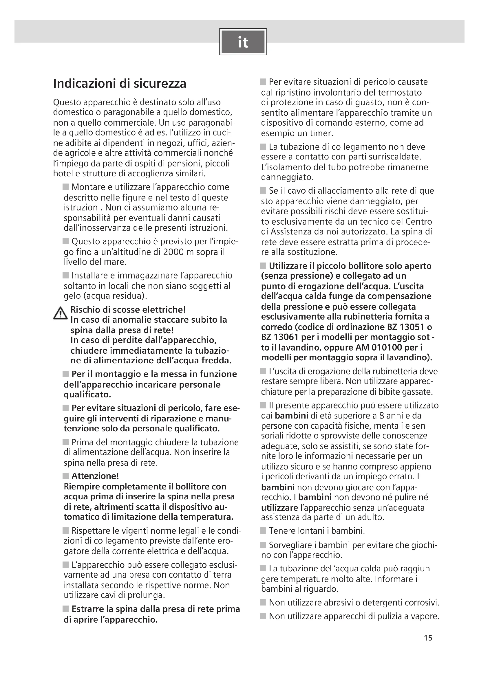 Indicazioni di sicurezza Questo apparecchio è destinato solo all’uso domestico o paragonabile a quello domestico, non a quello commerciale. Un uso paragonabi- le a quello domestico è ad es. l’utilizzo in cuci- ne adibite ai dipendenti in negozi, uffici, azien- de agricole e altre attività commerciali nonché l’impiego da parte di ospiti di pensioni, piccoli hotel e strutture di accoglienza similari. ■ Montare e utilizzare l’apparecchio come descritto nelle figure e nel testo di queste istruzioni. Non ci assumiamo alcuna re- sponsabilità per eventuali danni causati dall’inosservanza delle presenti istruzioni. ■ Questo apparecchio è previsto per l’impie- go fino a un’altitudine di 2000 m sopra il livello del mare. ■ Installare e immagazzinare l’apparecchio soltanto in locali che non siano soggetti al gelo (acqua residua). Rischio di scosse elettriche! In caso di anomalie staccare subito la spina dalla presa di rete! In caso di perdite dall’apparecchio, chiudere immediatamente la tubazio- ne di alimentazione dell’acqua fredda. ■ Per il montaggio e la messa in funzione dell’apparecchio incaricare personale qualificato. ■ Per evitare situazioni di pericolo, fare ese- guire gli interventi di riparazione e manu- tenzione solo da personale qualificato. ■ Prima del montaggio chiudere la tubazione di alimentazione dell’acqua. Non inserire la spina nella presa di rete. ■ Attenzione! Riempire completamente il bollitore con acqua prima di inserire la spina nella presa di rete, altrimenti scatta il dispositivo au- tomatico di limitazione della temperatura. ■ Rispettare le vigenti norme legali e le condi- zioni di collegamento previste dall’ente ero- gatore della corrente elettrica e dell’acqua. ■ L’apparecchio può essere collegato esclusi- vamente ad una presa con contatto di terra installata secondo le rispettive norme. Non utilizzare cavi di prolunga. ■ Estrarre la spina dalla presa di rete prima di aprire l’apparecchio. ■ Per evitare situazioni di pericolo causate dal ripristino involontario del termostato di protezione in caso di guasto, non è con- sentito alimentare l’apparecchio tramite un dispositivo di comando esterno, come ad esempio un timer. ■ La tubazione di collegamento non deve essere a contatto con parti surriscaldate. L’isolamento del tubo potrebbe rimanerne danneggiato. ■ Se il cavo di allacciamento alla rete di que- sto apparecchio viene danneggiato, per evitare possibili rischi deve essere sostitui- to esclusivamente da un tecnico del Centro di Assistenza da noi autorizzato. La spina di rete deve essere estratta prima di procede- re alla sostituzione. ■ Utilizzare il piccolo bollitore solo aperto (senza pressione) e collegato ad un punto di erogazione dell’acqua. L’uscita dell’acqua calda funge da compensazione della pressione e può essere collegata esclusivamente alla rubinetteria fornita a corredo (codice di ordinazione BZ 13051 o BZ 13061 per i modelli per montaggio sot - to il lavandino, oppure AM 010100 per i modelli per montaggio sopra il lavandino). ■ L’uscita di erogazione della rubinetteria deve restare sempre libera. Non utilizzare apparec- chiature per la preparazione di bibite gassate. ■ Il presente apparecchio può essere utilizzato dai bambini di età superiore a 8 anni e da persone con capacità fisiche, mentali e sen- soriali ridotte o sprovviste delle conoscenze adeguate, solo se assistiti, se sono state for- nite loro le informazioni necessarie per un utilizzo sicuro e se hanno compreso appieno i pericoli derivanti da un impiego errato. I bambini non devono giocare con l’appa- recchio. I bambini non devono né pulire né utilizzare l’apparecchio senza un’adeguata assistenza da parte di un adulto. ■ Tenere lontani i bambini. ■ Sorvegliare i bambini per evitare che giochi- no con l’apparecchio. ■ La tubazione dell’acqua calda può raggiun- gere temperature molto alte. Informare i bambini al riguardo. ■ Non utilizzare abrasivi o detergenti corrosivi. ■ Non utilizzare apparecchi di pulizia a vapore.16
