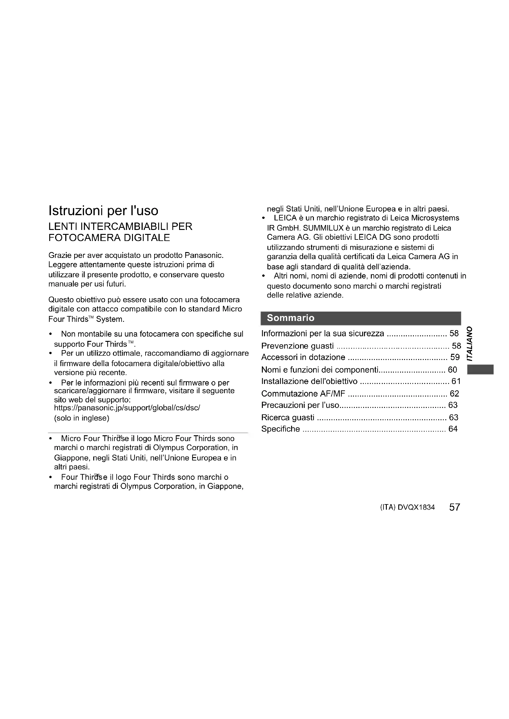 - e il logo Four Thirds sono marchi o marchi registrati di Olympus Corporation, in Giappone, negli Stati Uniti, nell’Unione Europea e in altri paesi. 0 LEICA è un marchio registrato di Leica Microsystems IR GmbH. SUMMILUX è un marchio registrato di Leica Camera AG. Gli obiettivi LEICA DG sono prodotti utilizzando strumenti di misurazione e sistemi di garanzia della qualità certificati da Leica Camera AG in base agli standard di qualità dell’azienda. 0 Altri nomi, nomi di aziende, nomi di prodotti contenuti in questo documento sono marchi o marchi registrati delle relative aziende. Informazioni per la sua sicurezza p. 58