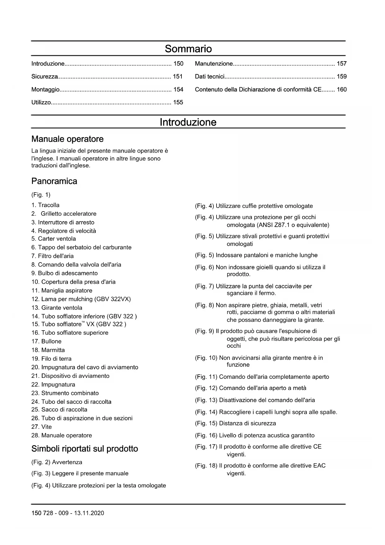 Simboli riportati sul prodotto (Fig. 2) Avvertenza (Fig. 3) Leggere il presente manuale (Fig. 4) Utilizzare protezioni per la testa omologate (Fig. 4) Utilizzare cuffie protettive omologate (Fig. 4) Utilizzare una protezione per gli occhi omologata (ANSI Z87.1 o equivalente) (Fig. 5) Utilizzare stivali protettivi e guanti protettivi omologati (Fig. 5) Indossare pantaloni e maniche lunghe (Fig. 6) Non indossare gioielli quando si utilizza il prodotto. (Fig. 7) Utilizzare la punta del cacciavite per sganciare il fermo. (Fig. 8) Non aspirare pietre, ghiaia, metalli, vetri rotti, pacciame di gomma o altri materiali che possano danneggiare la girante. (Fig. 9) Il prodotto può causare l'espulsione di oggetti, che può risultare pericolosa per gli occhi (Fig. 10) Non avvicinarsi alla girante mentre è in funzione (Fig. 11) Comando dell'aria completamente aperto (Fig. 12) Comando dell'aria aperto a metà (Fig. 13) Disattivazione del comando dell'aria (Fig. 14) Raccogliere i capelli lunghi sopra alle spalle. (Fig. 15) Distanza di sicurezza (Fig. 16) Livello di potenza acustica garantito (Fig. 17) Il prodotto è conforme alle direttive CE vigenti. (Fig. 18) Il prodotto è conforme alle direttive EAC vigenti. 150 728 - 009 - 13.11.2020(Fig. 19) Il prodotto è conforme alle direttive vigenti in Ucraina. (Fig. 20) Il prodotto è conforme alle norme sulla compatibilità elettromagnetica (EMC) australiane. Nota: I restanti simboli/decalcomanie sul prodotto riguardano particolari requisiti necessari per ottenere la certificazione in altre aree commerciali. Emissioni Euro V AVVERTENZA: La manomissione del motore rende nulla l'omologazione UE del prodotto. Responsabilità del prodotto Come indicato nelle leggi vigenti in materia di responsabilità obbligatoria sul prodotto, non siamo responsabili per eventuali danni causati dal nostro prodotto se: