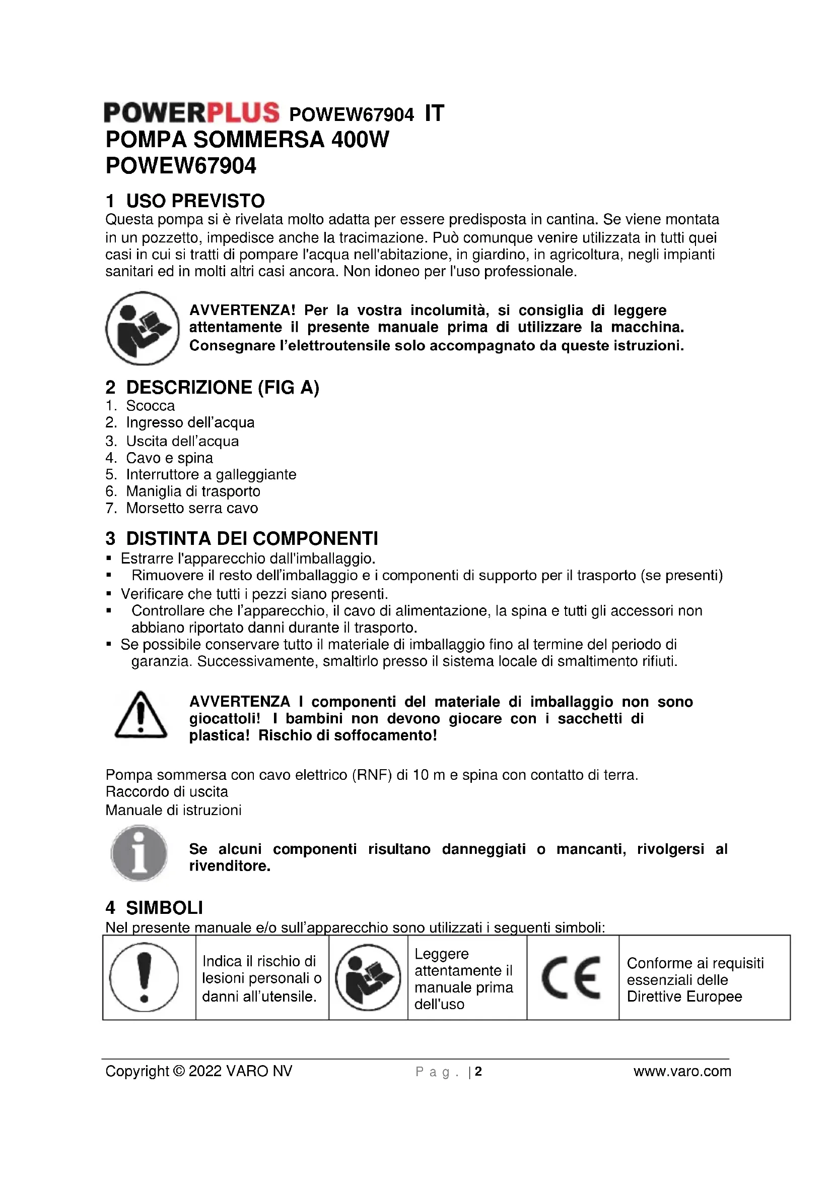 - in modo fisso, ma con tubi di gomma flessibili Da rispettare! Nell'installazione tenere presente che la pompa non può mai venir montata semplicemente appesa alla tubazione di mandata o al cavo della corrente. La pompa sommersa a motore deve venir rispettivamente appesa al gancio apposito o appoggiata sul fondo del pozzetto. Per garantire un funzionamento perfetto della pompa, il fondo del pozzetto deve essere sempre libero dal fango o da altre impurità. Se il livello dell'acqua è troppo basso, il fango che si trova nel pozzetto può seccarsi rapidamente e impedire alla pompa di mettersi in moto. È perciò necessario controllare regolarmente la pompa sommersa a motore (eseguire delle prove di messa in moto). L'interruttore a galleggiante è così regolato da permettere un'immediata messa in esercizio della pompa. Avvertenza! Il pozzetto della pompa deve avere almeno le dimensioni di 40 x 40 x 50 cm in modo tale che l'interruttore a galleggiante possa muoversi liberamente.POWEW67904 IT Copyright © 2022 VARO NV P a g . | 4 www.varo.com Il collegamento alla rete La pompa da voi acquistata è già dotata di una spina con contatto di terra ed è concepita per essere collegata ad una presa con contatto di terra con 230 V - 50 Hz. Accertatevi che la presa abbia un dispositivo di protezione sufficiente (almeno 6 A) e sia perfettamente in ordine. La pompa è pronta per funzionare non appena la spina della pompa è inserita nella presa. Avvertenza! Se il cavo di alimentazione o la spina vengono danneggiati per cause esterne, il cavo non deve venir riparato, ma deve venir sostituito con uno nuovo.
