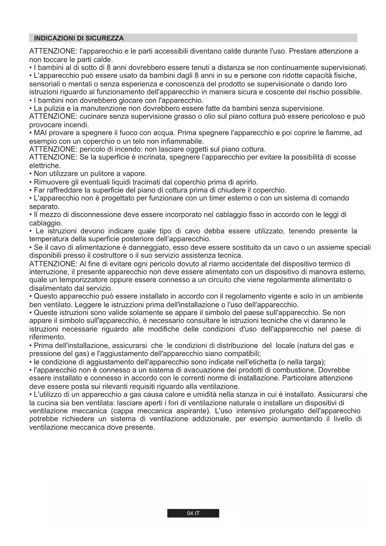- L'utilizzo di un apparecchio a gas causa calore e umidità nella stanza in cui è installato. Assicurarsi che la cucina sia ben ventilata: lasciare aperti i fori di ventilazione naturale o installare un dispositivi di ventilazione meccanica (cappa meccanica aspirante). L'uso intensivo prolungato dell'apparecchio potrebbe richiedere un sistema di ventilazione addizionale, per esempio aumentando il livello di ventilazione meccanica dove presente.
