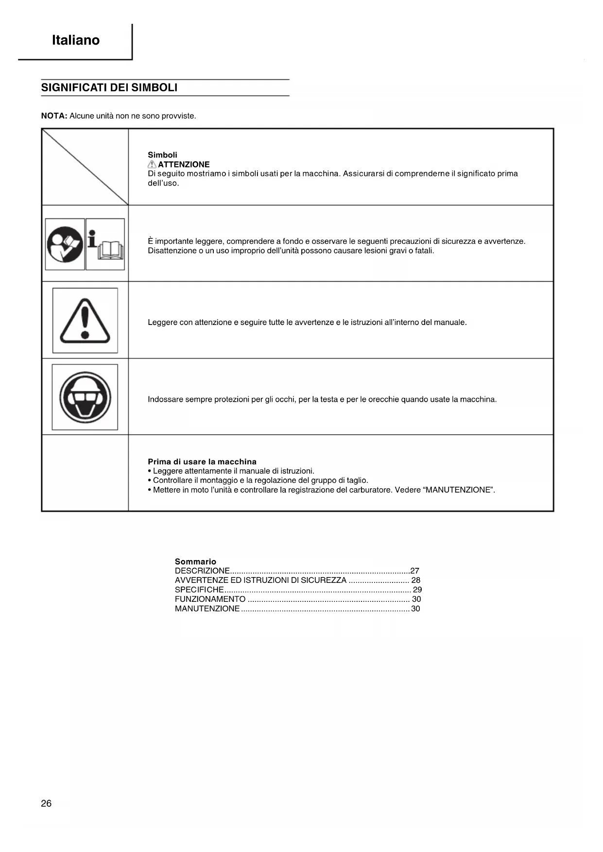 NOTA: Alcune unità non ne sono provviste. Simboli ATTENZIONE Di seguito mostriamo i simboli usati per la macchina. Assicurarsi di comprenderne il signifi cato prima dell’uso. È importante leggere, comprendere a fondo e osservare le seguenti precauzioni di sicurezza e avvertenze. Disattenzione o un uso improprio dell’unità possono causare lesioni gravi o fatali. Leggere con attenzione e seguire tutte le avvertenze e le istruzioni all’interno del manuale. Indossare sempre protezioni per gli occhi, per la testa e per le orecchie quando usate la macchina. Prima di usare la macchina