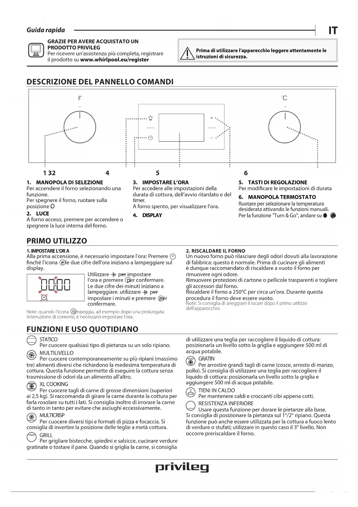 PRODOTTO PRIVILEG Per ricevere un'assistenza più completa, registrare il prodotto su www . whirlpool . eu/register Prima di utilizzare l'apparecchio leggere attentamente le istruzioni di sicurezza.