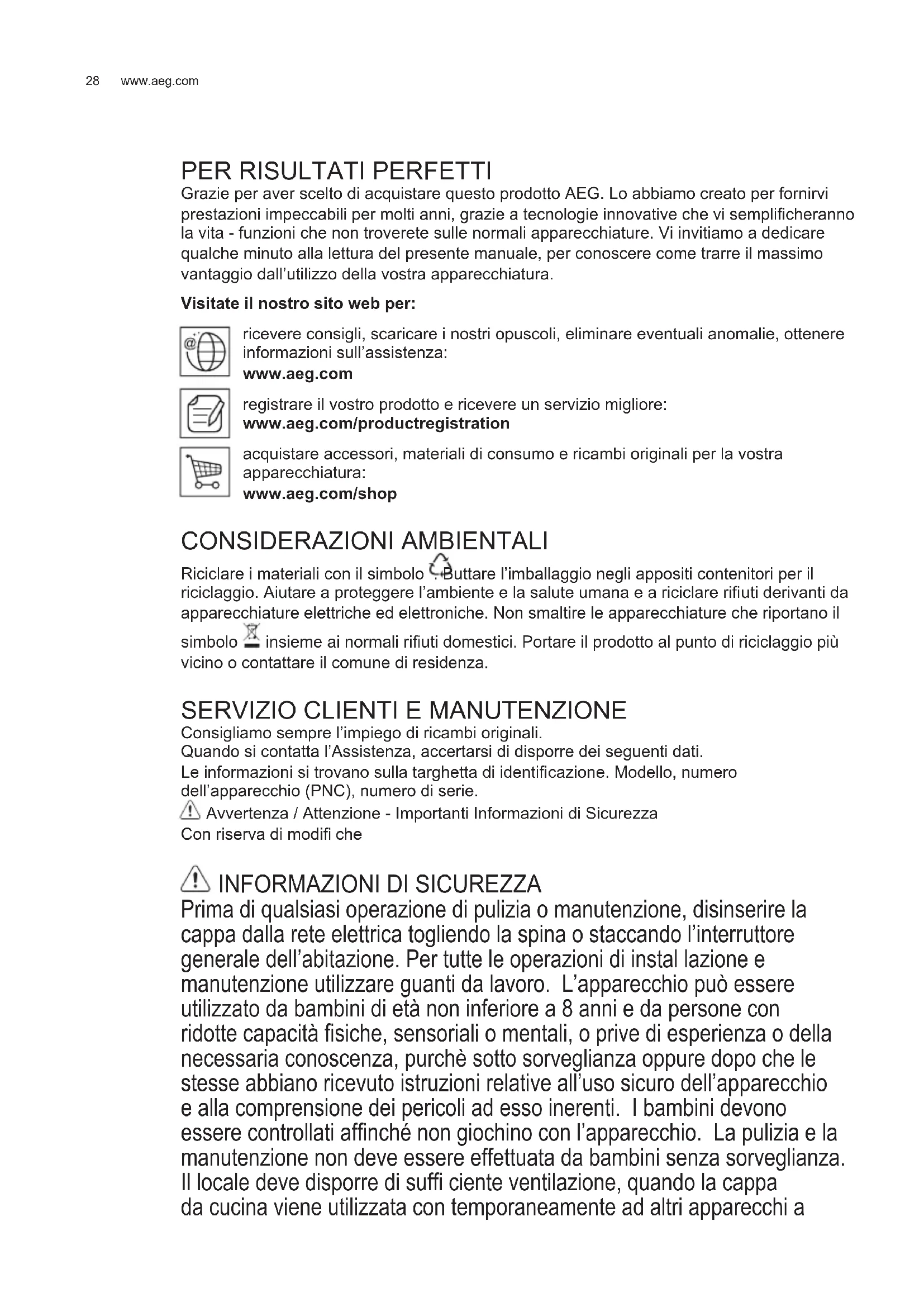 Grazie per aver scelto di acquistare questo prodotto AEG. Lo abbiamo creato per fornirvi prestazioni impeccabili per molti anni, grazie a tecnologie innovative che vi semplifi cheranno la vita - funzioni che non troverete sulle normali apparecchiature. Vi invitiamo a dedicare qualche minuto alla lettura del presente manuale, per conoscere come trarre il massimo vantaggio dall’utilizzo della vostra apparecchiatura. Visitate il nostro sito web per: ricevere consigli, scaricare i nostri opuscoli, eliminare eventuali anomalie, ottenere informazioni sull’assistenza: www.aeg.com registrare il vostro prodotto e ricevere un servizio migliore: www.aeg.com/productregistration acquistare accessori, materiali di consumo e ricambi originali per la vostra apparecchiatura: www.aeg.com/shop CONSIDERAZIONI AMBIENTALI Riciclare i materiali con il simbolo . Buttare l’imballaggio negli appositi contenitori per il riciclaggio. Aiutare a proteggere l’ambiente e la salute umana e a riciclare rifi uti derivanti da apparecchiature elettriche ed elettroniche. Non smaltire le apparecchiature che riportano il simbolo insieme ai normali rifi uti domestici. Portare il prodotto al punto di riciclaggio più vicino o contattare il comune di residenza.