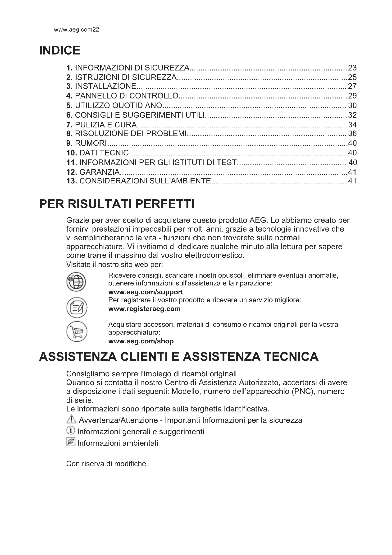 Grazie per aver scelto di acquistare questo prodotto AEG. Lo abbiamo creato per fornirvi prestazioni impeccabili per molti anni, grazie a tecnologie innovative che vi semplificheranno la vita - funzioni che non troverete sulle normali apparecchiature. Vi invitiamo di dedicare qualche minuto alla lettura per sapere come trarre il massimo dal vostro elettrodomestico. Visitate il nostro sito web per: Ricevere consigli, scaricare i nostri opuscoli, eliminare eventuali anomalie, ottenere informazioni sull'assistenza e la riparazione: www.aeg.com/support Per registrare il vostro prodotto e ricevere un servizio migliore: www.registeraeg.com Acquistare accessori, materiali di consumo e ricambi originali per la vostra apparecchiatura: www.aeg.com/shop