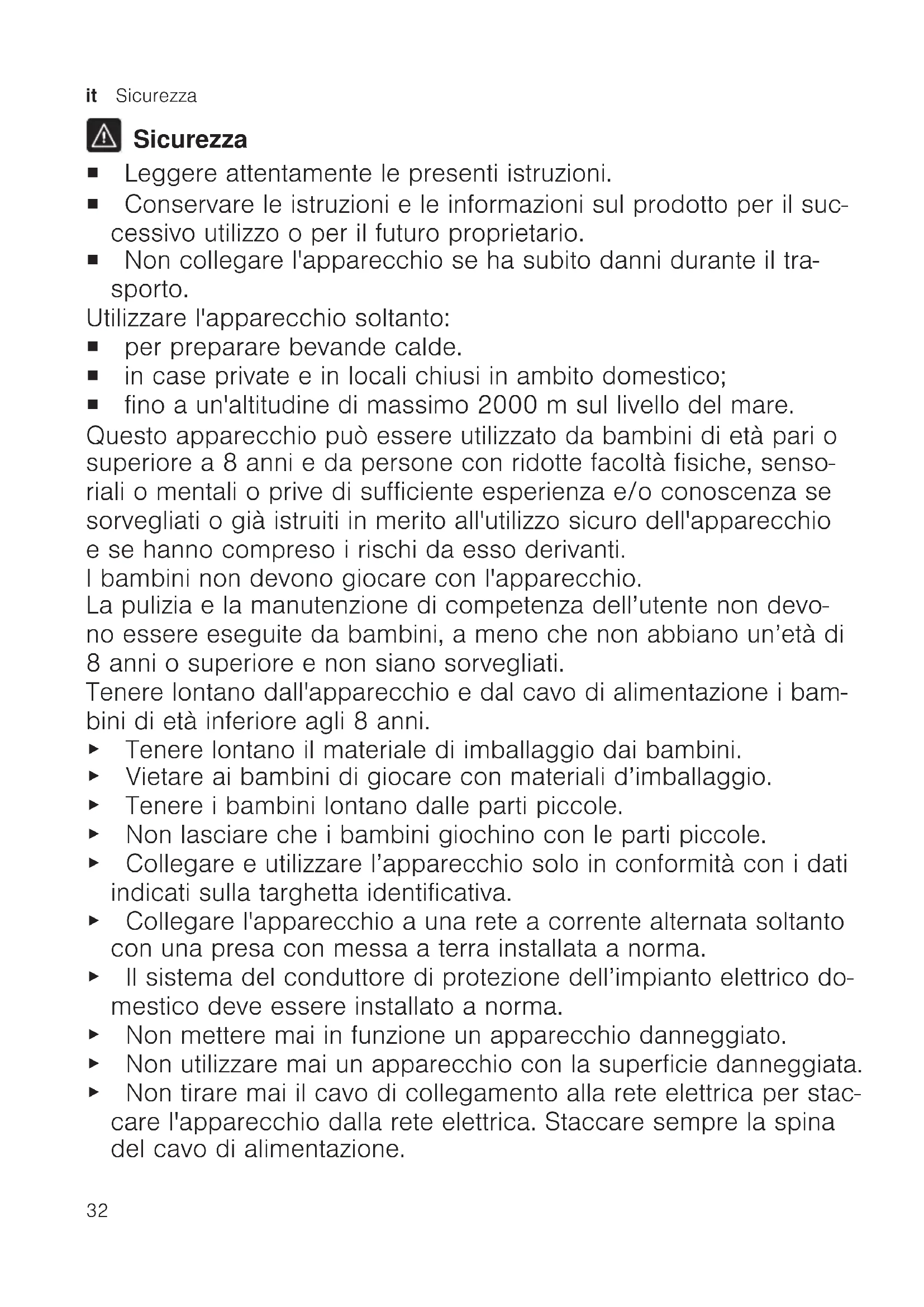 Sicurezza ¡ Leggere attentamente le presenti istruzioni. ¡ Conservare le istruzioni e le informazioni sul prodotto per il suc- cessivo utilizzo o per il futuro proprietario. ¡ Non collegare l'apparecchio se ha subito danni durante il tra- sporto. Utilizzare l'apparecchio soltanto: ¡ per preparare bevande calde. ¡ in case private e in locali chiusi in ambito domestico; ¡ fino a un'altitudine di massimo 2000m sul livello del mare. Questo apparecchio può essere utilizzato da bambini di età pari o superiore a 8 anni e da persone con ridotte facoltà fisiche, senso- riali o mentali o prive di sufficiente esperienza e/o conoscenza se sorvegliati o già istruiti in merito all'utilizzo sicuro dell'apparecchio e se hanno compreso i rischi da esso derivanti. I bambini non devono giocare con l'apparecchio. La pulizia e la manutenzione di competenza dell’utente non devo- no essere eseguite da bambini, a meno che non abbiano un’età di 8 anni o superiore e non siano sorvegliati. Tenere lontano dall'apparecchio e dal cavo di alimentazione i bam- bini di età inferiore agli 8 anni. ▶ Tenere lontano il materiale di imballaggio dai bambini. ▶ Vietare ai bambini di giocare con materiali d’imballaggio. ▶ Tenere i bambini lontano dalle parti piccole. ▶ Non lasciare che i bambini giochino con le parti piccole. ▶ Collegare e utilizzare l’apparecchio solo in conformità con i dati indicati sulla targhetta identificativa. ▶ Collegare l'apparecchio a una rete a corrente alternata soltanto con una presa con messa a terra installata a norma. ▶ Ilsistema delconduttore diprotezione dell’impianto elettrico do- mestico deve essere installato anorma. ▶ Non mettere mai in funzione un apparecchio danneggiato. ▶ Non utilizzare mai un apparecchio con la superficie danneggiata. ▶ Non tirare mai il cavo di collegamento alla rete elettrica per stac- care l'apparecchio dalla rete elettrica. Staccare sempre la spina del cavo di alimentazione.Sicurezza it Stampato su carta riciclata al 100% 33 ▶ Se l'apparecchio o il cavo di alimentazione è danneggiato, stac- care subito la spina di alimentazione del cavo di alimentazione e spegnere il fusibile nella scatola dei fusibili. ▶ Rivolgersi al servizio di assistenza clienti. →Pagina 37 ▶ Solo il personale adeguatamente specializzato e formato può eseguire riparazioni sull'apparecchio. ▶ Per la riparazione dell'apparecchio possono essere impiegati soltanto pezzi di ricambio originali. ▶ Al fine di evitare pericoli, se il cavo di alimentazione di questo apparecchio subisce danni deve essere sostituito dal produttore, dal suo servizio di assistenza clienti o da persona in possesso di simile qualifica. ▶ Non immergere mai l'apparecchio o il cavo di alimentazione nell'acqua. ▶ Il connettore dell'apparecchio non deve venire a contatto con li- quidi. ▶ Utilizzare l'apparecchio esclusivamente in luoghi chiusi. ▶ Non esporre mai l'apparecchio a calore e umidità eccessivi. ▶ Non lavare l'apparecchio con pulitori a vapore o idropulitrici. ▶ Aerare sufficientemente l'apparecchio. ▶ Non mettere mai in funzione l'apparecchio all'interno di un mobi- le. ▶ Sorvegliare sempre l’apparecchio durante ilfunzionamento. ▶ Non utilizzare cavi di prolunga o prese multiple. ▶ Utilizzare esclusivamente gli adattatori e i cavi di alimentazione approvati dal produttore. ▶ Se il cavo di alimentazione è troppo corto e non è disponibile un cavo di alimentazione più lungo, contattare un elettricista per modificare l'installazione domestica. ▶ Non aprire mai l'unità di infusione durante l'esercizio. ▶ Utilizzare solo i TDISC Tassimo originali. ▶ Non utilizzare mai un T DISC danneggiato. ▶ Non utilizzare mai un T DISC di una bevanda più di una volta. ▶ Non toccare mai le parti calde dell'apparecchio. ▶ Dopo l'uso lasciar raffreddare le parti calde dell'apparecchio pri- ma di toccarle. ▶ Eventualmente lasciar raffreddare le bevande.it Panoramica 34 Stampato su carta riciclata al 100% ▶ Evitare il contatto della pelle con i liquidi e i vapori che fuoriesco- no. ▶ Per evitare lesioni, utilizzare l'apparecchio soltanto conforme- mente all'uso previsto. ▶ Durante l'inserimento del T DISC o durante la pulizia prestare at- tenzione alle dita. ▶ I portatori di impianti elettronici devono mantenersi a una distan- za minima di 10cm dall'apparecchio. ▶ Mantenere una distanza minima di 10 cm anche dal serbatoio dell'acqua quando è estratto. ▶ Osservare le istruzioni per la pulizia dell'apparecchio per assicu- rare l'igiene. Panoramica Di seguito è riportata una panoramica dei componenti dell'apparecchio. Nota:A seconda del modello è possibile che vi siano alcune differenze per quanto concerne colori e vari dettagli.