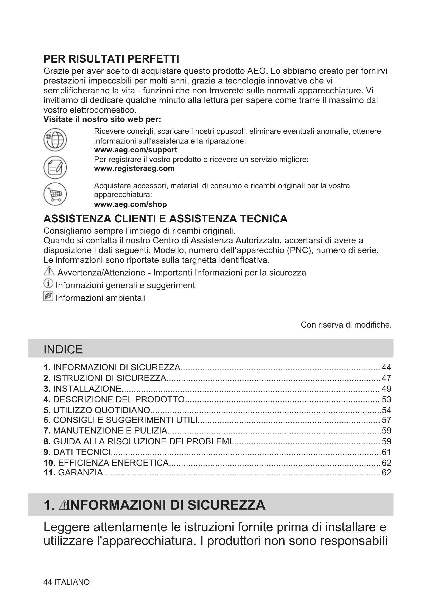 Consigliamo sempre l’impiego di ricambi originali. Quando si contatta il nostro Centro di Assistenza Autorizzato, accertarsi di avere a disposizione i dati seguenti: Modello, numero dell’apparecchio (PNC), numero di serie. Le informazioni sono riportate sulla targhetta identificativa. Avvertenza/Attenzione - Importanti Informazioni per la sicurezza Informazioni generali e suggerimenti Informazioni ambientali Con riserva di modifiche. INDICE