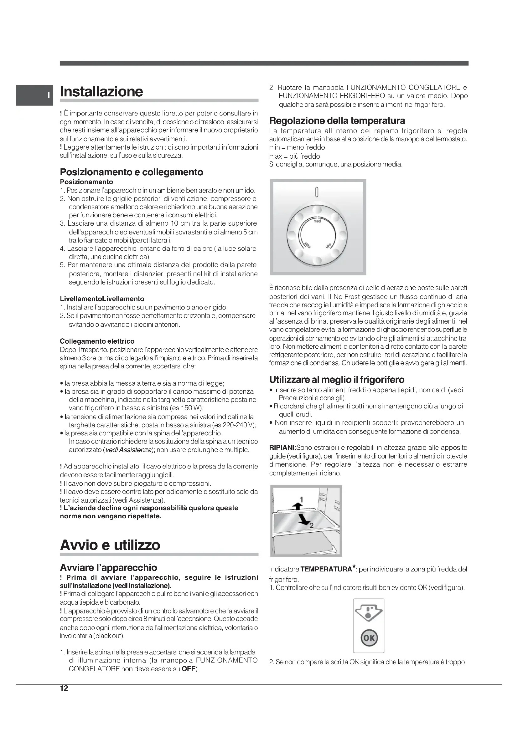 FUNZIONAMENTO FRIGORIFERO su un valore medio. Dopo qualche ora sarà possibile inserire alimenti nel frigorifero. Regolazione della temperatura La temperatura all'interno del reparto frigorifero si regola automaticamente in base alla posizione della manopola del termostato. min = meno freddo max = più freddo Si consiglia, comunque, una posizione media. È riconoscibile dalla presenza di celle d’aerazione poste sulle pareti posteriori dei vani. Il No Frost gestisce un flusso continuo di aria fredda che raccoglie l’umidità e impedisce la formazione di ghiaccio e brina: nel vano frigorifero mantiene il giusto livello di umidità e, grazie all’assenza di brina, preserva le qualità originarie degli alimenti; nel vano congelatore evita la formazione di ghiaccio rendendo superflue le operazioni di sbrinamento ed evitando che gli alimenti si attacchino tra loro. Non mettere alimenti o contenitori a diretto contatto con la parete refrigerante posteriore, per non ostruire i fori di aerazione e facilitare la formazione di condensa. Chiudere le bottiglie e avvolgere gli alimenti. Utilizzare al meglio il frigorifero