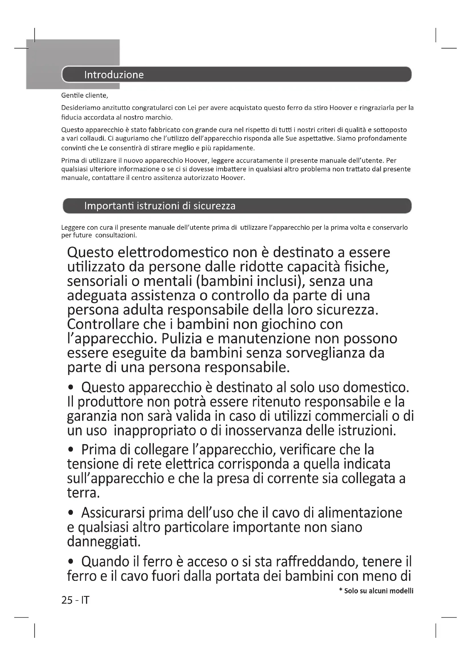 Prima di utilizzare il nuovo apparecchio Hoover, leggere accuramente il presente manuale dell'utente. Per qualsiasi ulteriori informazione o se ci si dovesse imbattere in qualiasi altri problema non trattato dal presente manuale, contattare il centro assistenza autorizzato Hoover.