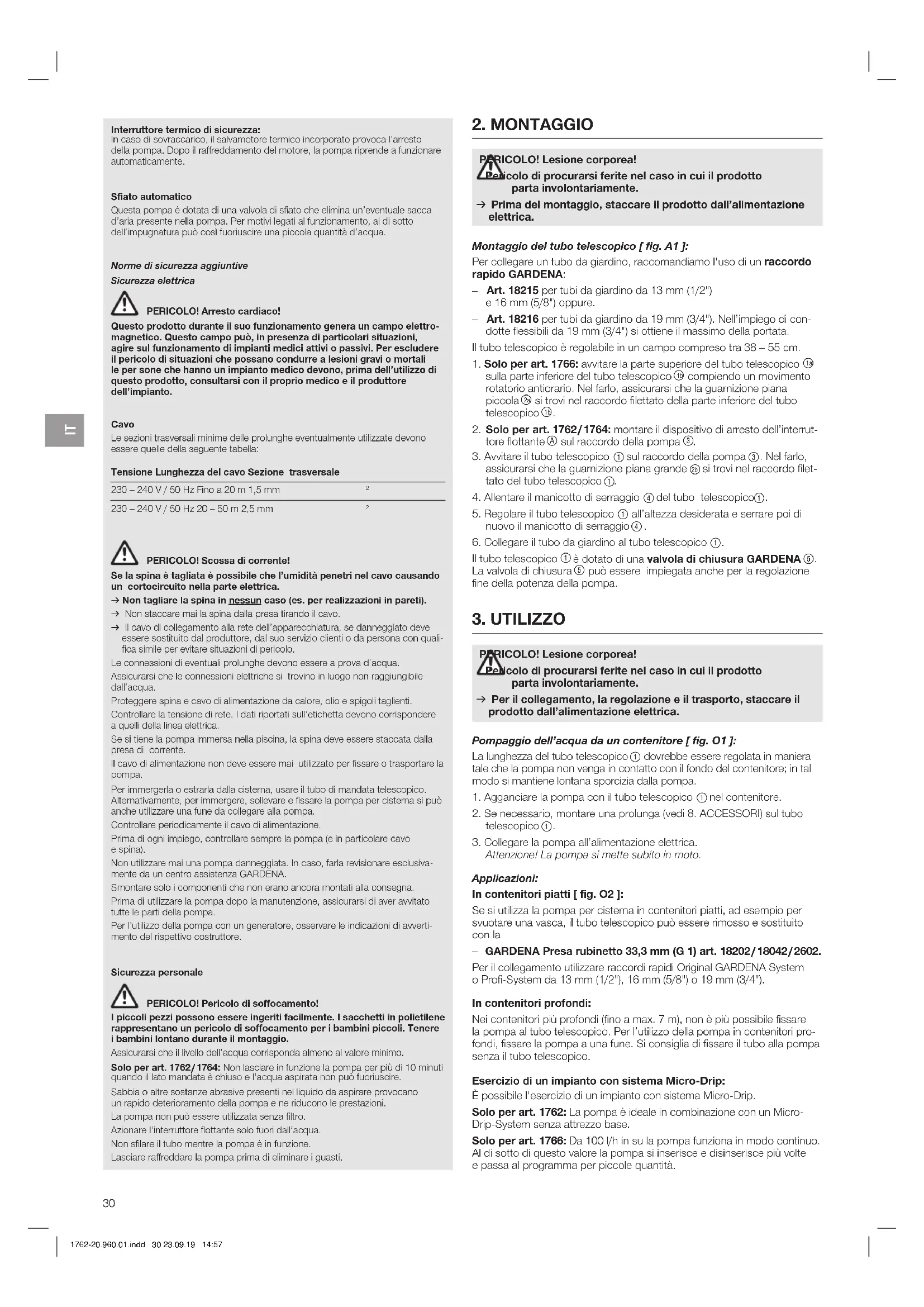 PERICOLO! Scossa di corrente! Se la spina è tagliata è possibile che l’umidità penetri nel cavo causando un cortocircuito nella parte elettrica. v Non tagliare la spina in nessun caso (es. per realizzazioni in pareti). v Non staccare mai la spina dalla presa tirando il cavo. v Il cavo di collegamento alla rete dell’apparecchiatura, se danneggiato deve essere sostituito dal produttore, dal suo servizio clienti o da persona con quali- fica simile per evitare situazioni di pericolo. Le connessioni di eventuali prolunghe devono essere a prova d’acqua. Assicurarsi che le connessioni elettriche si trovino in luogo non raggiungibile dall’acqua. Proteggere spina e cavo di alimentazione da calore, olio e spigoli taglienti. Controllare la tensione di rete. I dati riportati sull’etichetta devono corrispondere a quelli della linea elettrica. Se si tiene la pompa immersa nella piscina, la spina deve essere staccata dalla presa di corrente. Il cavo di alimentazione non deve essere mai utilizzato per fissare o trasportare la pompa. Per immergerla o estrarla dalla cisterna, usare il tubo di mandata telescopico. Alternativamente, per immergere, sollevare e fissare la pompa per cisterna si può anche utilizzare una fune da collegare alla pompa. Controllare periodicamente il cavo di alimentazione. Prima di ogni impiego, controllare sempre la pompa (e in particolare cavo e spina). Non utilizzare mai una pompa danneggiata. In caso, farla revisionare esclusiva- mente da un centro assistenza GARDENA. Smontare solo i componenti che non erano ancora montati alla consegna. Prima di utilizzare la pompa dopo la manutenzione, assicurarsi di aver avvitato tutte le parti della pompa. Per l’utilizzo della pompa con un generatore, osservare le indicazioni di avverti- mento del rispettivo costruttore. Sicurezza personale PERICOLO! Pericolo di soffocamento! I piccoli pezzi possono essere ingeriti facilmente. I sacchetti in polietilene rappresentano un pericolo di soffocamento per i bambini piccoli. Tenere ibambini lontano durante il montaggio. Assicurarsi che il livello dell’acqua corrisponda almeno al valore minimo. Solo per art. 1762 / 1764: Non lasciare in funzione la pompa per più di 10 minuti quando il lato mandata è chiuso e l’acqua aspirata non può fuoriuscire. Sabbia o altre sostanze abrasive presenti nel liquido da aspirare provocano un rapido deterioramento della pompa e ne riducono le prestazioni. La pompa non può essere utilizzata senza filtro. Azionare l’interruttore flottante solo fuori dall’acqua. Non sfilare il tubo mentre la pompa è in funzione. Lasciare raffreddare la pompa prima di eliminare i guasti.