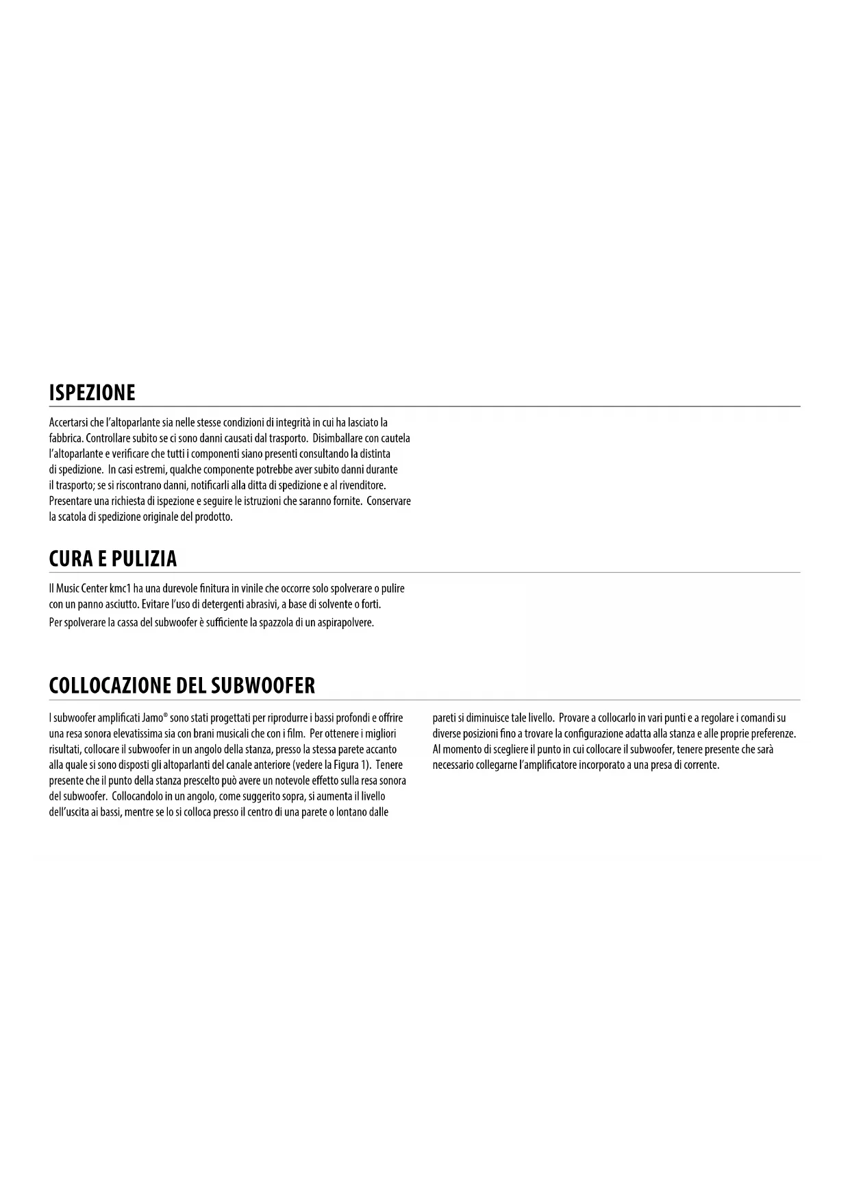 AUTO OFF LFE DOWN UP 40Hz 80Hz 120Hz LFE Figura 2 Conexão Do Subwoofer Receiver A/V Surround LFE Figura 3 Pés de borrachaCOLLOCAZIONE DEL SUBWOOFER I subwoofer amplicati Jamo® sono stati progettati per riprodurre i bassi profondi e orire una resa sonora elevatissima sia con brani musicali che con i lm. Per ottenere i migliori risultati, collocare il subwoofer in un angolo della stanza, presso la stessa parete accanto alla quale si sono disposti gli altoparlanti del canale anteriore (vedere la Figura 1). Tenere presente che il punto della stanza prescelto può avere un notevole eetto sulla resa sonora del subwoofer. Collocandolo in un angolo, come suggerito sopra, si aumenta il livello dell’uscita ai bassi, mentre se lo si colloca presso il centro di una parete o lontano dalle pareti si diminuisce tale livello. Provare a collocarlo in vari punti e a regolare i comandi su diverse posizioni no a trovare la congurazione adatta alla stanza e alle proprie preferenze. Al momento di scegliere il punto in cui collocare il subwoofer, tenere presente che sarà necessario collegarne l’amplicatore incorporato a una presa di corrente. Accertarsi che l’altoparlante sia nelle stesse condizioni di integrità in cui ha lasciato la fabbrica. Controllare subito se ci sono danni causati dal trasporto. Disimballare con cautela l’altoparlante e vericare che tutti i componenti siano presenti consultando la distinta di spedizione. In casi estremi, qualche componente potrebbe aver subito danni durante il trasporto; se si riscontrano danni, noticarli alla ditta di spedizione e al rivenditore. Presentare una richiesta di ispezione e seguire le istruzioni che saranno fornite. Conservare la scatola di spedizione originale del prodotto. ISPEZIONE Il Music Center kmc1 ha una durevole nitura in vinile che occorre solo spolverare o pulire con un panno asciutto. Evitare l’uso di detergenti abrasivi, a base di solvente o forti. Per spolverare la cassa del subwoofer è suciente la spazzola di un aspirapolvere.