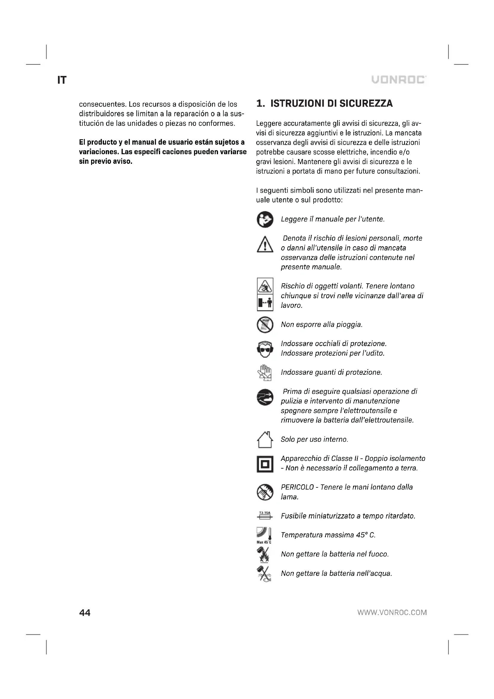 Sono state utilizzate parti di ricambio non originali. Ciò costituisce l’unica garanzia espressa o implicita fornita dall’azienda. Non esistono altre garanzie es- presse o implicite che si estendono oltre il presente documento, ivi comprese le garanzie implicite di commerciabilità e idoneità per uno scopo particola- re. In nessun caso VONROC sarà responsabile di eventuali danni incidentali o consequenziali. I rime- di dei rivenditori saranno limitati alla riparazione o sostituzione di unità o parti non conformi. Il prodotto e il manuale per l’utente sono soggetti a modifi che. I dati tecnici possono essere modifi cati senza ulteriore notifi ca.52