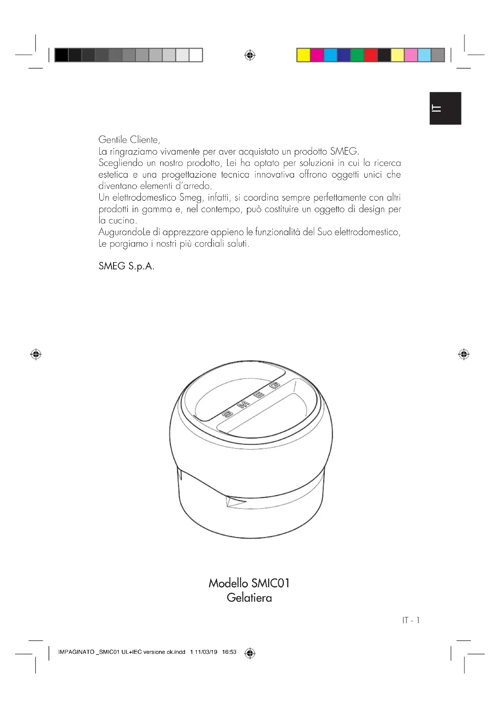 Gentile Cliente, La ringraziamo vivamente per aver acquistato un prodotto SMEG. Scegliendo un nostro prodotto, Lei ha optato per soluzioni in cui la ricerca estetica e una progettazione tecnica innovativa offrono oggetti unici che diventano elementi d’arredo. Un elettrodomestico Smeg, infatti, si coordina sempre perfettamente con altri prodotti in gamma e, nel contempo, può costituire un oggetto di design per la cucina. AugurandoLe di apprezzare appieno le funzionalità del Suo elettrodomestico, Le porgiamo i nostri più cordiali saluti. SMEG S.p.A. Modello SMIC01 Gelatiera IMPAGINATO _SMIC01 UL+IEC versione ok.indd 1 11/03/19 16:532 - IT Avvertenze SICUREZZA Avvertenze fondamentali per la sicu
