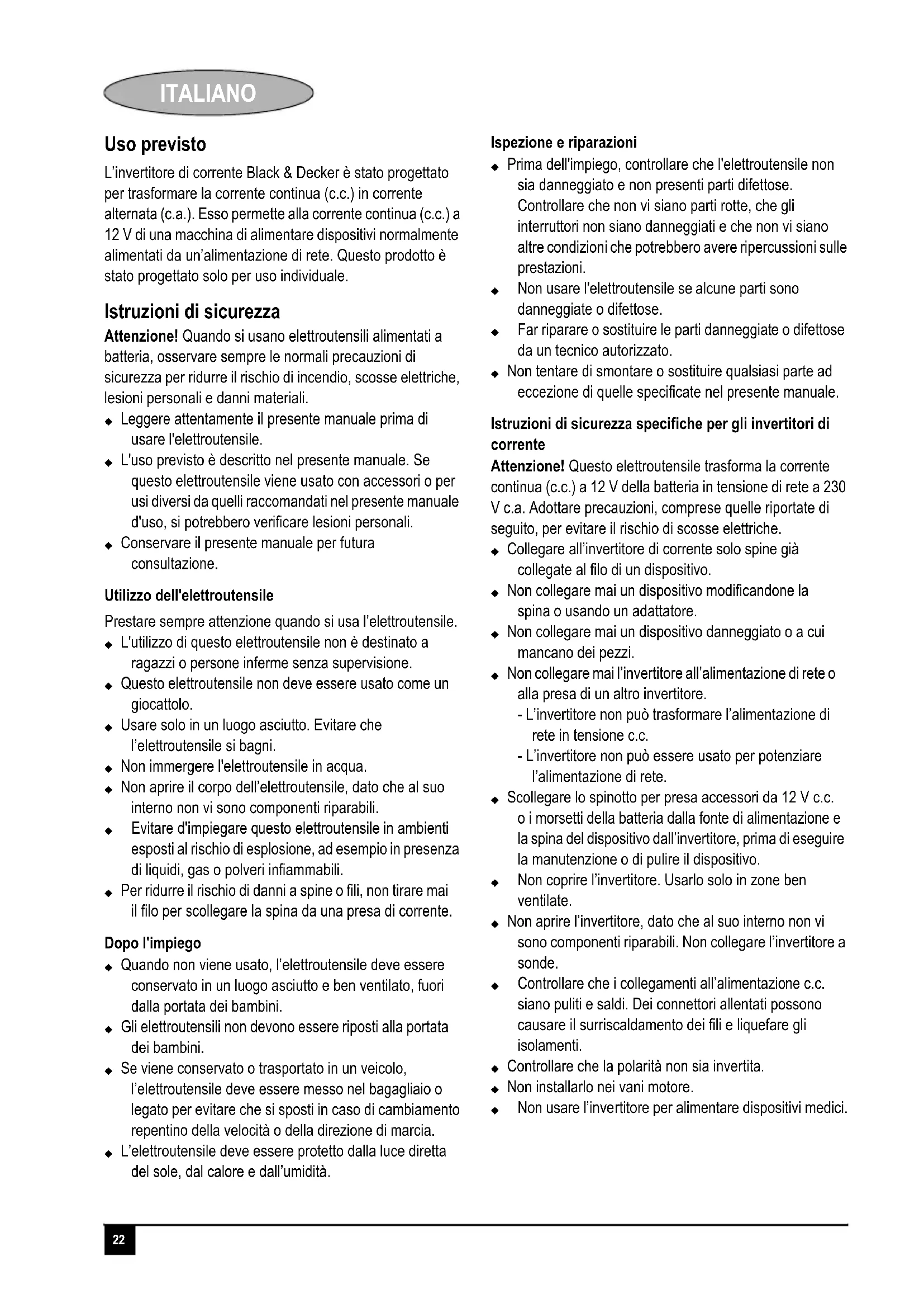 L'invertitore di corrente Black & Decker è stato progettato per trasformare la corrente continua (c.c.) in corrente alternata (c.a.). Esso permette alla corrente continua (c.c.) a 12 V di una macchina di alimentare dispositiivi normalmente alimentati da un'alimentazione di rete. Questo prodotto è stato progettato solo per uso individuale.