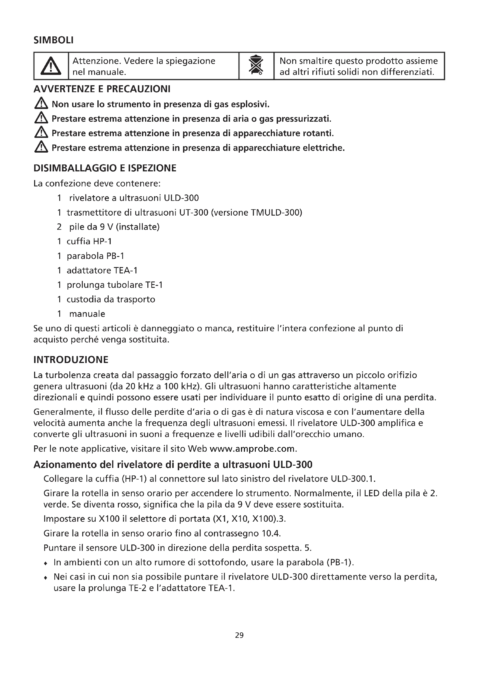 La confezione deve contenere: 1 rivelatore a ultrasuoni ULD-300 1 trasmettitore di ultrasuoni UT-300 (versione TMULD-300) 2 pile da 9 V (installate) 1 cuffia HP-1 1 parabola PB-1 1 adattatore TEA-1 1 prolunga tubolare TE-1 1 custodia da trasporto 1 manuale Se uno di questi articoli è danneggiato o manca, restituire l’intera confezione al punto di acquisto perché venga sostituita. INTRODUZIONE La turbolenza creata dal passaggio forzato dell’aria o di un gas attraverso un piccolo orifizio genera ultrasuoni (da 20 kHz a 100 kHz). Gli ultrasuoni hanno caratteristiche altamente direzionali e quindi possono essere usati per individuare il punto esatto di origine di una perdita. Generalmente, il flusso delle perdite d’aria o di gas è di natura viscosa e con l’aumentare della velocità aumenta anche la frequenza degli ultrasuoni emessi. Il rivelatore ULD-300 amplifica e converte gli ultrasuoni in suoni a frequenze e livelli udibili dall’orecchio umano. Per le note applicative, visitare il sito Web www.amprobe.com. Azionamento del rivelatore di perdite a ultrasuoni ULD-300 Collegare la cuffia (HP-1) al connettore sul lato sinistro del rivelatore ULD-300.1. Girare la rotella in senso orario per accendere lo strumento. Normalmente, il LED della pila è 2. verde. Se diventa rosso, significa che la pila da 9 V deve essere sostituita. Impostare su X100 il selettore di portata (X1, X10, X100).3. Girare la rotella in senso orario fino al contrassegno 10.4. Puntare il sensore ULD-300 in direzione della perdita sospetta. 5. In ambienti con un alto rumore di sottofondo, usare la parabola (PB-1). ♦ Nei casi in cui non sia possibile puntare il rivelatore ULD-300 direttamente verso la perdita, ♦ usare la prolunga TE-2 e l’adattatore TEA-1.30 Man mano che ci si avvicina al punto di origine della perdita, i LED nella barra verticale si 6. accendono. La barra a LED rappresenta solo una misura relativa. Quando accende 10 segmenti, lo strumento ha raggiunto la lettura massima per la portata selezionata. Ridurre la sensibilità girando la rotella in senso antiorario o selezionare una portata meno sensibile. Ripetere fino a isolare la perdita. Abbassare la sensibilità per confermare l’individuazione della 7. vera fonte della perdita, piuttosto che di una riflessione del suono. In genere, le riflessioni degli ultrasuoni non sono potenti quanto gli ultrasuoni provenienti dalla fonte. Azionamento del trasmettitore di ultrasuoni UT-300 (fornito con la versione TMULD-300) Il trasmettitore UT-300 è in grado di fornire segnali a ultrasuoni nelle situazioni in cui la perdita d’aria o di gas non ha pressione sufficiente per creare ultrasuoni. Questo trasmettitore permette l’esame di fessure e aperture. Portare l’interruttore di accensione/spegnimento su ON. Il LED di alimentazione (POWER) 1. si accende. Impostare il livello del segnale in uscita spostando selettore MODE.2. Al termine del test, spegnere lo strumento.3.