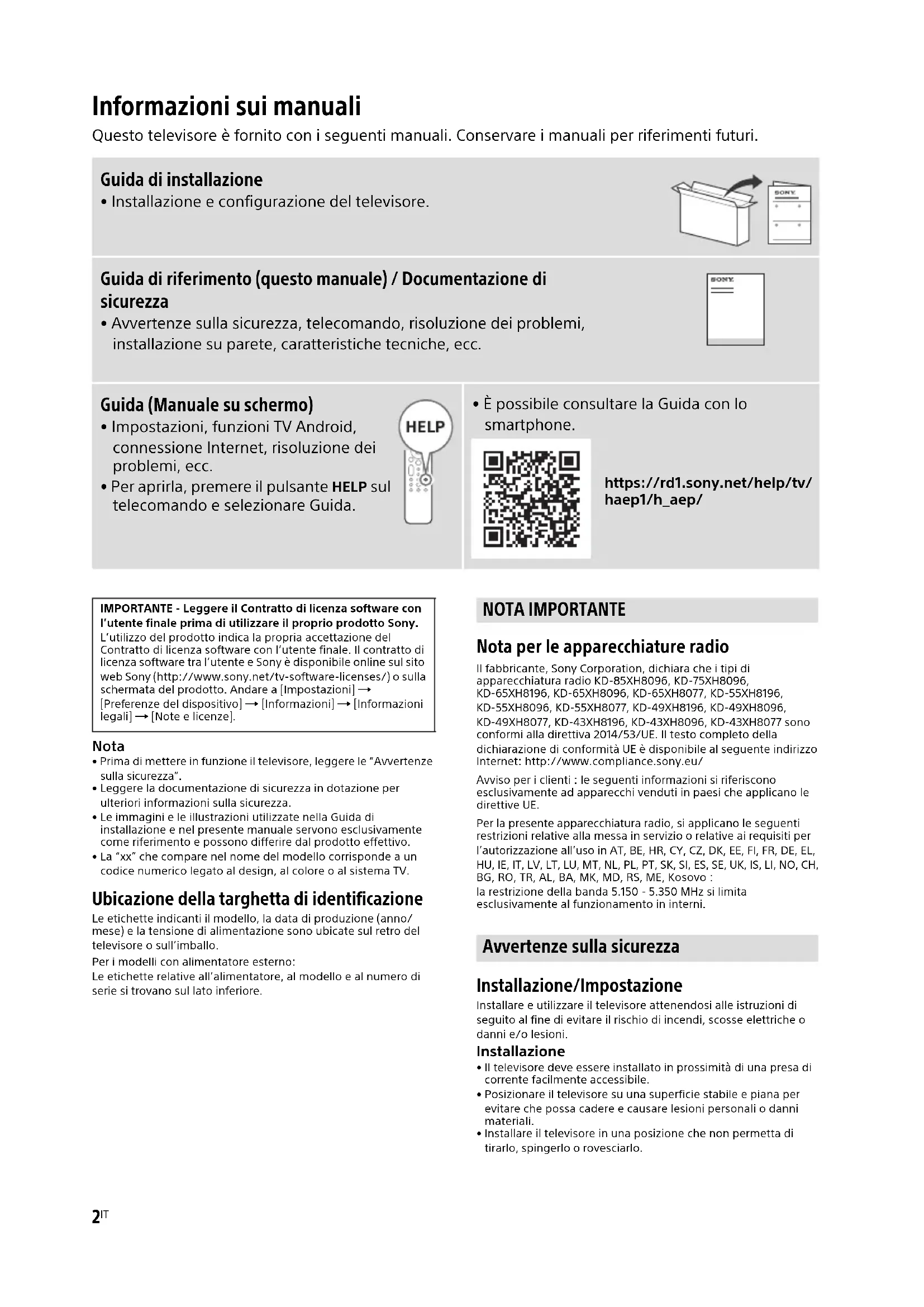 - È possibile consultare la Guida con lo smartphone. https://rd1.sony.net/help/tv/ haep1/h_aep/ IMPORTANTE - Leggere il Contratto di licenza software con l’utente finale prima di utilizzare il proprio prodotto Sony. L’utilizzo del prodotto indica la propria accettazione del Contratto di licenza software con l’utente finale. Il contratto di licenza software tra l’utente e Sony è disponibile online sul sito web Sony (http://www.sony.net/tv-software-licenses/) o sulla schermata del prodotto. Andare a [Impostazioni] [Preferenze del dispositivo] [Informazioni] [Informazioni legali] [Note e licenze]. NOTA IMPORTANTE Avvertenze sulla sicurezza3