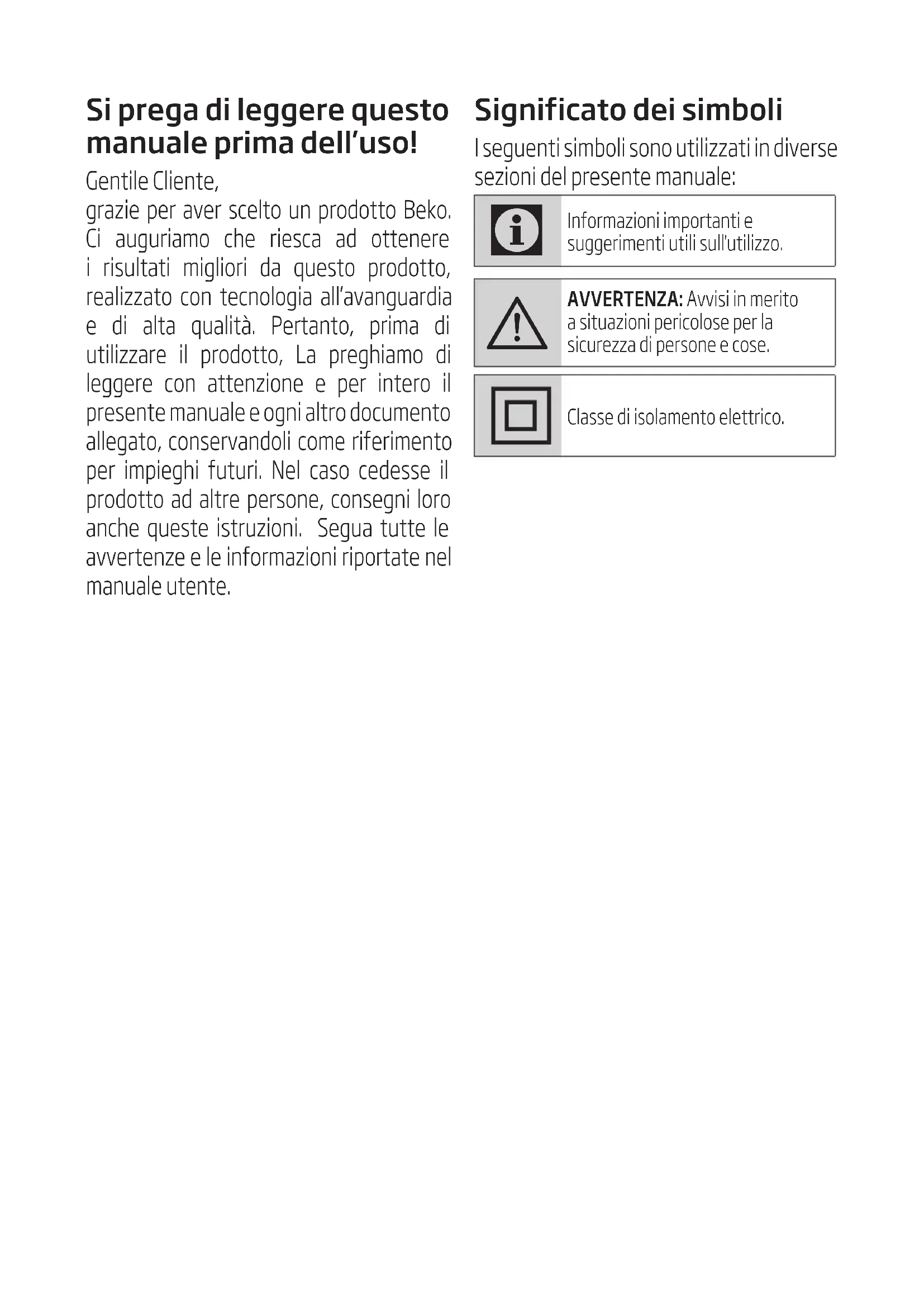 AVVERTENZA: Avvisi in merito a situazioni pericolose per la sicurezza di persone e cose. Classe di isolamento elettrico.1. Pulsante di accensione/spegnimento