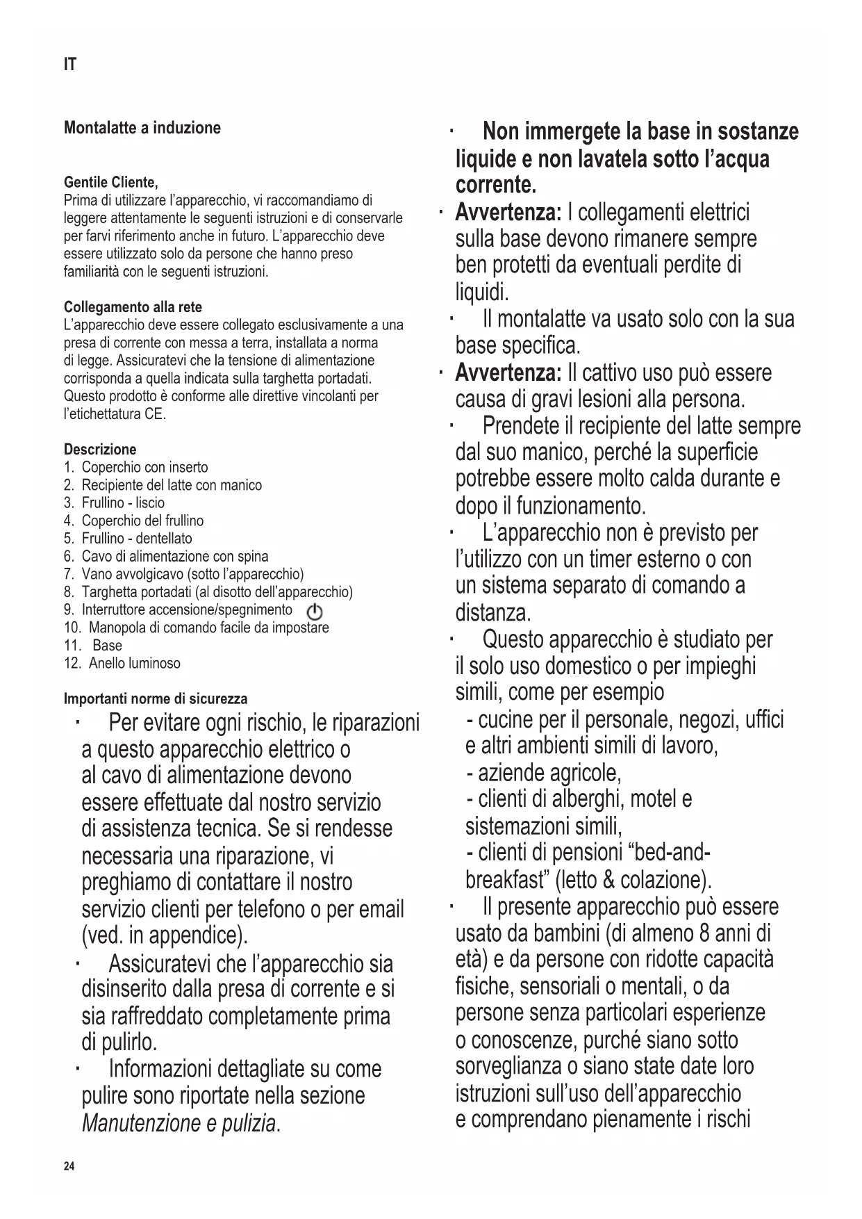 Importanti norme di sicurezza ∙ Per evitare ogni rischio, le riparazioni a questo apparecchio elettrico o al cavo di alimentazione devono essere effettuate dal nostro servizio di assistenza tecnica. Se si rendesse necessaria una riparazione, vi preghiamo di contattare il nostro servizio clienti per telefono o per email (ved. in appendice). ∙ Assicuratevi che l’apparecchio sia disinserito dalla presa di corrente e si sia raffreddato completamente prima di pulirlo. ∙ Informazioni dettagliate su come pulire sono riportate nella sezione Manutenzione e pulizia. ∙ Non immergete la base in sostanze liquide e non lavatela sotto l’acqua corrente. ∙ Avvertenza: I collegamenti elettrici sulla base devono rimanere sempre ben protetti da eventuali perdite di liquidi. ∙ Il montalatte va usato solo con la sua basespecica. ∙ Avvertenza: Il cattivo uso può essere causa di gravi lesioni alla persona. ∙ Prendete il recipiente del latte sempre dalsuomanico,perchélasupercie potrebbe essere molto calda durante e dopo il funzionamento. ∙ L’apparecchio non è previsto per l’utilizzo con un timer esterno o con un sistema separato di comando a distanza. ∙ Questo apparecchio è studiato per il solo uso domestico o per impieghi simili, come per esempio - cucineperilpersonale,negozi,ufci e altri ambienti simili di lavoro, - aziende agricole, - clienti di alberghi, motel e sistemazioni simili, - clienti di pensioni “bed-and- breakfast” (letto & colazione). ∙ Il presente apparecchio può essere usato da bambini (di almeno 8 anni di età) e da persone con ridotte capacità siche,sensorialiomentali,oda persone senza particolari esperienze o conoscenze, purché siano sotto sorveglianza o siano state date loro istruzioni sull’uso dell’apparecchio e comprendano pienamente i rischi IT25 142 x 208 mm e le precauzioni di sicurezza che l’apparecchio comporta. ∙ Ai bambini non deve essere consentito di giocare con l’apparecchio. ∙ Ai bambini non deve essere consentito di effettuare operazioni di pulizia o di manutenzione sull’apparecchio a meno che non siano supervisionati da un adulto e siano comunque più grandi di 8 anni di età. ∙ L’apparecchio e il cavo di alimentazione devono essere tenuti sempre fuori della portata di bambini di età inferiore agli 8 anni. ∙ Avvertenza: Tutto il materiale di imballaggio deve essere tenuto fuori della portata dei bambini a causa del rischio potenziale esistente, per esempio di soffocamento. ∙ Prima di ogni utilizzo dell’apparecchio, controllate attentamente che l’apparecchio e gli accessori inseriti non presentino tracce di deterioramento. Se per esempiofossecadutobattendosuunasupercie dura, o se è stata usata una forza eccessiva nel tirare il cavo di alimentazione, l’apparecchio non va più usato: danni anche invisibili ad occhio nudo potrebbero comportare conseguenze negative sulla sicurezza nel funzionamento dell’apparecchio. ∙ Questo apparecchio è studiato unicamente per riscaldare e montare latte, per preparare cioccolata calda e cacao. Non inserite altri tipi di sostanze liquide o solide nel recipiente. ∙ Non lasciate incustodito il montalatte quando è in funzione. ∙ Rispettate sempre, ad ogni ciclo, i segni dei livelli di min. e max riportati all’interno del recipiente. ∙ La sporgenza sul fondo del recipiente (segno del livello min.) deve essere coperta di latte. Se non c’è abbastanza latte, l’apparecchio può surriscaldarsi. ∙ Attenzione: Riempire eccessivamente il recipiente può essere pericoloso nel caso il latte montato schizzi fuori. ∙ Attenzione: Il coperchio deve rimanere sempre inserito durante il funzionamento. ∙ Non coprite le aperture di ventilazione presenti sul retro. ∙ L’apparecchio può essere messo in funzione solo con gli accessori originali forniti dal produttore. ∙ L’apparecchio deve essere sistemato sempre su una superciesolidaepiana. ∙ Non poggiate mai l’apparecchio e il cavo di alimentazionesopraammelibereosuperciriscaldanti (es. fornelli a gas o piastre elettriche). ∙ Non lasciate pendere liberamente il cavo di alimentazione; tenete il cavo lontano dagli elementi caldi dell’apparecchio. ∙ Disinserite sempre la spina dalla presa di corrente - in caso di cattivo funzionamento, - dopo l’uso, - prima di pulire l’apparecchio. ∙ Per disinserire la spina dalla presa di corrente, non tirate mai il cavo di alimentazione ma afferrate direttamente la spina. ∙ Nessuna responsabilità verrà assunta in caso di danni risultanti da un uso errato o dalla non conformità alle istruzioni. Prima di adoperare l’apparecchio per la prima volta ∙ Rimuovete tutti i materiali di imballaggio e gli adesivi promozionali rimasti, e controllate che ci siano tutti i componenti accessori. ∙ Al primo utilizzo dell’apparecchio o dopo un lungo periodo di inattività, pulitelo accuratamente nel modo indicato nella sezione Manutenzione e pulizia. Conservazione del cavo di alimentazione ∙ Nella base dell’apparecchio, c’è un vano che serve per riporre il cavo di alimentazione. ∙ Allungate il cavo sino alla lunghezza necessaria prima di usare l’apparecchio. ∙ Avvolgete di nuovo il cavo di alimentazione dopo l’uso. Istruzioni d’uso Coperchio ∙ Il coperchio deve rimanere sempre inserito durante il funzionamento. ∙ Per aggiungere ingredienti durante la preparazione, ruotate e poi togliete l’inserto del coperchio. ∙ Il frullino liscio può essere conservato inserendolo sull’inserto del coperchio. Anello luminoso Rosso È stata selezionata una funzione a riscaldamento. Blu È stata selezionata una funzione senza riscaldamento. Luce ssa Il processo è in esecuzione. Luce lampeggiante rossa o blu L’apparecchio è in attesa di un comando, il processo di preparazione è completo o è incorso un errore (ved. Risoluzione di problemiallanedelmanualediistruzioni).26 142 x 208 mm Scelta del frullino Sono disponibili i seguenti tipi di frullino: è liscio è den
