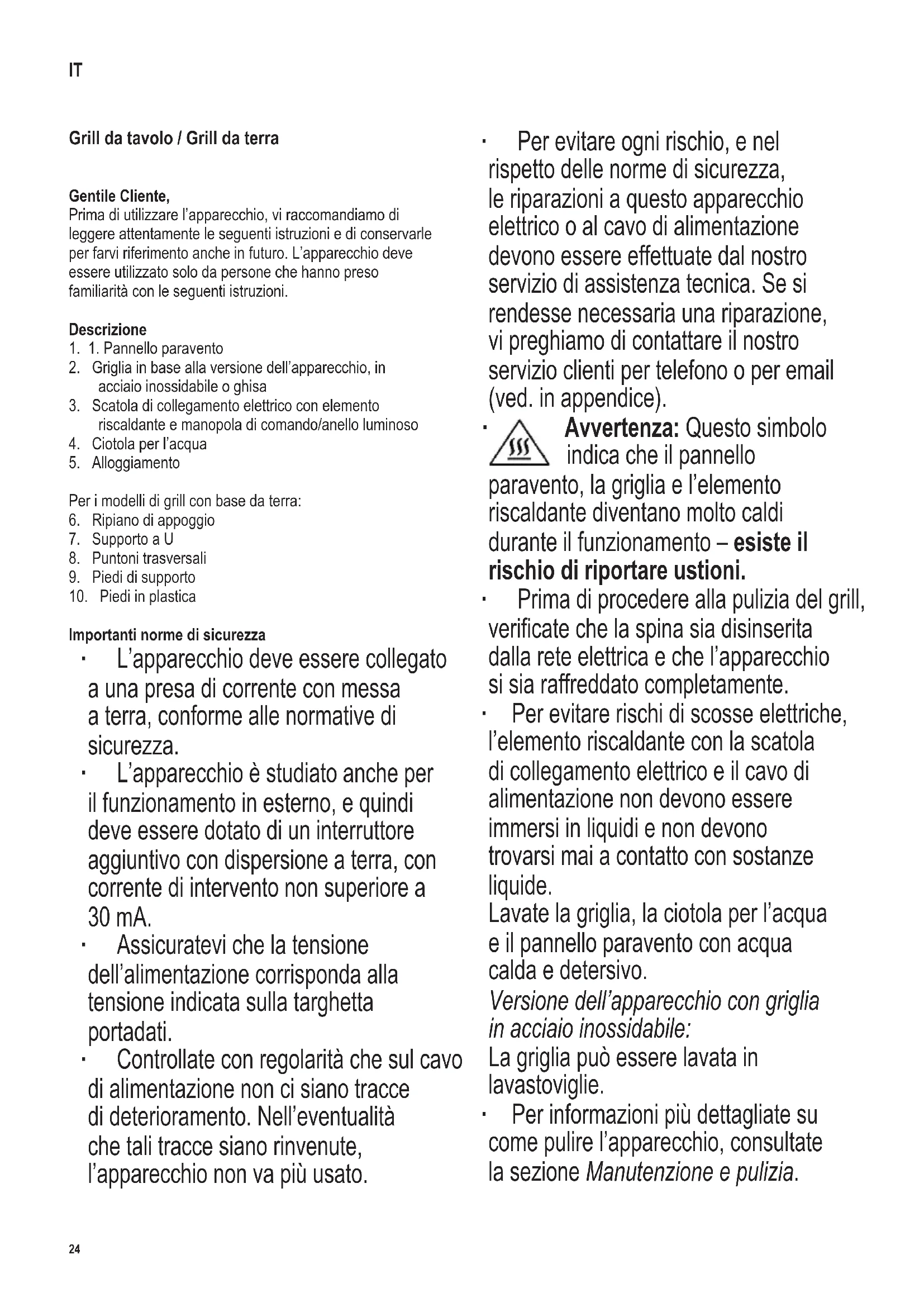 - Avverenza! Lasciare sempre raffreddare completeness la griglia prima di spostarla, pulirla, coprirla o riporla.