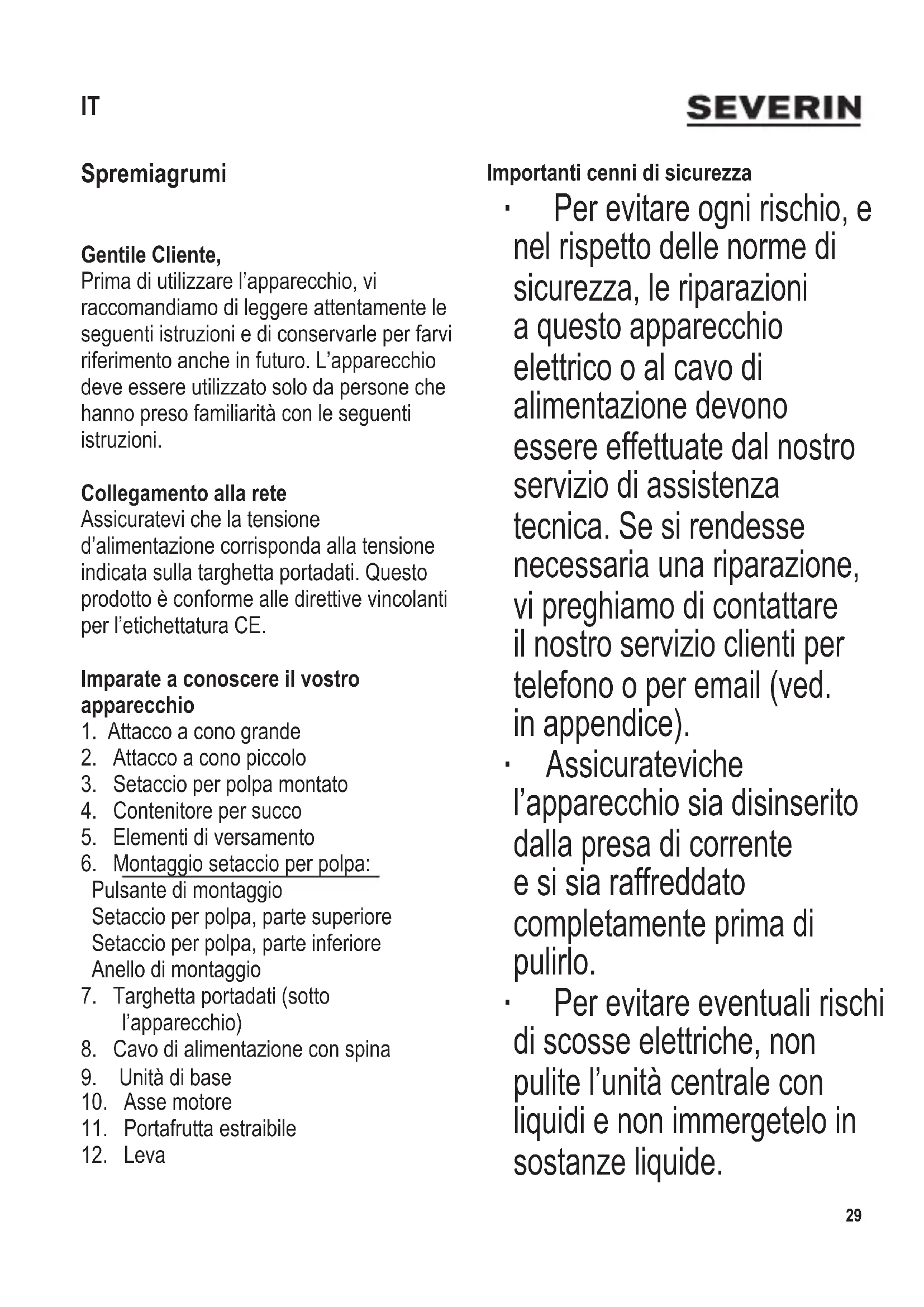 Importanti cenni di sicurezza ∙ Per evitare ogni rischio, e nel rispetto delle norme di sicurezza, le riparazioni a questo apparecchio elettrico o al cavo di alimentazione devono essere effettuate dal nostro servizio di assistenza tecnica. Se si rendesse necessaria una riparazione, vi preghiamo di contattare il nostro servizio clienti per telefono o per email (ved. in appendice). ∙ Assicuratevi che l’apparecchio sia disinserito dalla presa di corrente e si sia raffreddato completamente prima di pulirlo. ∙ Per evitare eventuali rischi di scosse elettriche, non pulite l’unità centrale con liquidi e non immergetelo in sostanze liquide. IT30 104 x 142 mm ∙ Gli accessori devono essere puliti con acqua calda e un detersivo leggero. ∙ Per informazioni più dettagliate su come pulire l’apparecchio, consultate la sezione Manutenzione e pulizia. ∙ Disinserite sempre la spina dalla presa - prima di montare o smontare l’apparecchio, - in caso di cattivo funzionamento, - se lasciato incustodito, - dopo l’uso, - prima di pulire l’apparecchio. ∙ Avvertenza! Il cattivo uso può essere causa di gravi lesioni alla persona. ∙ Questo apparecchio è studiato per il solo uso domestico o per impieghi simili, come per esempio - in cucine per il personale, negozi,ufciealtri ambienti simili di lavoro, - in aziende agricole, - da clienti di alberghi, motel e sistemazioni simili, - da clienti di pensioni “bed- and-breakfast” (letto & colazione). ∙ Questo apparecchio può essere utilizzato anche dai bambini (di almeno 8 anni di età) purché sotto sorveglianza o siano state date loro istruzioni sulle modalità di utilizzo dell’apparecchio e abbiamo compreso perfettamente le precauzioni di sicurezza e gli eventuali pericoli che esso comporta. ∙ Ai bambini non deve essere consentito di effettuare operazioni di pulizia o di manutenzione104 x 142 mm