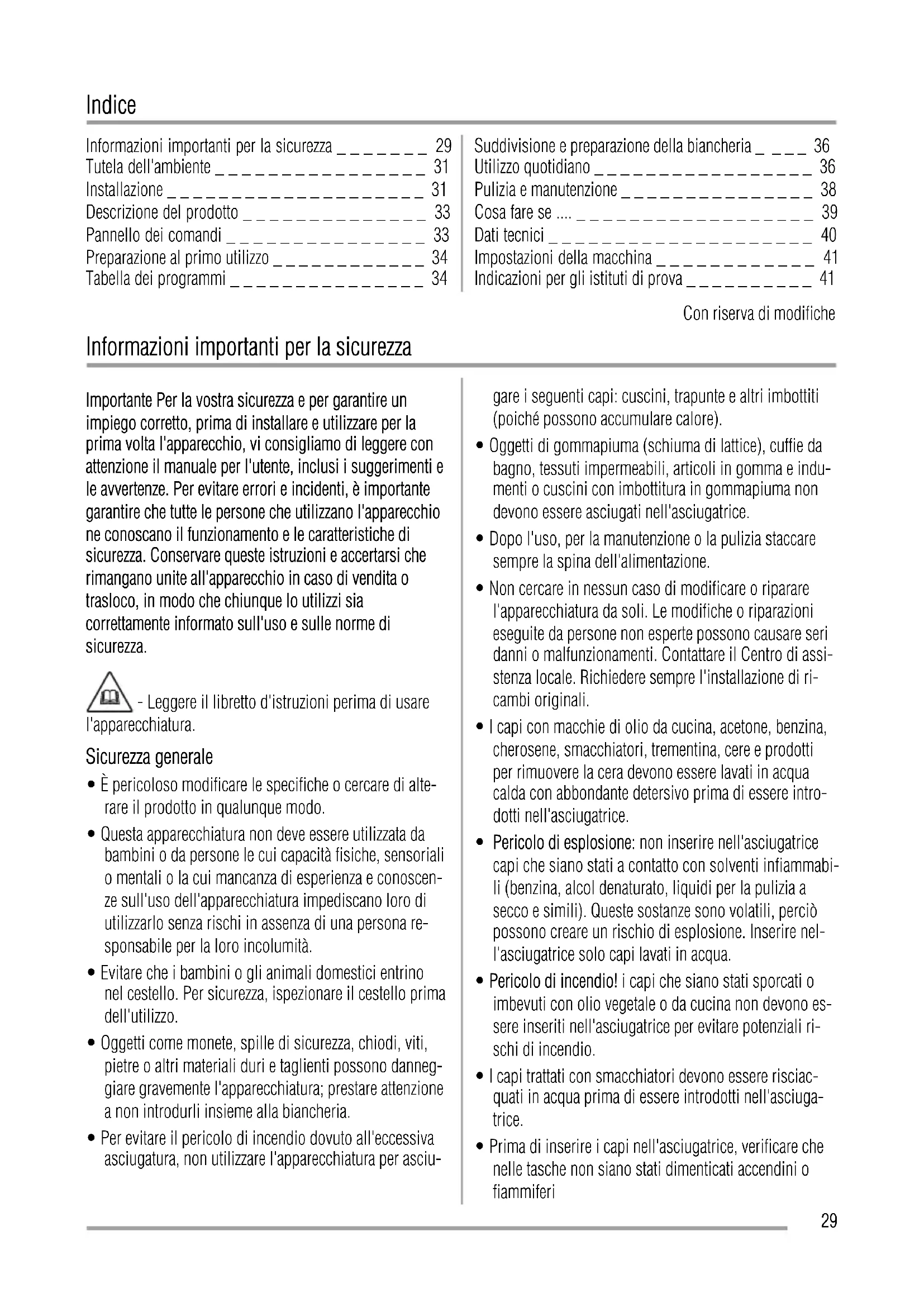 - Efficacité de condensation (corrigée en fonction de l'humidité résiduelle) pendant un cycle Coton prêt à ranger avec charge nominale et demi-charge Tous les cycles doivent être contrôlés en conformité avec la norme EN 61121 (sèche-linge à tambour pour usage domestique – Méthodes de mesure des performances). 28Indice Informazioni importanti per la sicurezza _ _ _ _ _ _ _ 29 Tutela dell'ambiente _ _ _ _ _ _ _ _ _ _ _ _ _ _ _ _ 31 Installazione _ _ _ _ _ _ _ _ _ _ _ _ _ _ _ _ _ _ _ _ 31 Descrizione del prodotto _ _ _ _ _ _ _ _ _ _ _ _ _ _ 33 Pannello dei comandi _ _ _ _ _ _ _ _ _ _ _ _ _ _ _ 33 Preparazione al primo utilizzo _ _ _ _ _ _ _ _ _ _ _ _ 34 Tabella dei programmi _ _ _ _ _ _ _ _ _ _ _ _ _ _ _ 34 Suddivisione e preparazione della biancheria _ _ _ _ 36 Utilizzo quotidiano _ _ _ _ _ _ _ _ _ _ _ _ _ _ _ _ _ 36 Pulizia e manutenzione _ _ _ _ _ _ _ _ _ _ _ _ _ _ _ 38 Cosa fare se .... _ _ _ _ _ _ _ _ _ _ _ _ _ _ _ _ _ _ 39 Dati tecnici _ _ _ _ _ _ _ _ _ _ _ _ _ _ _ _ _ _ _ _ 40 Impostazioni della macchina _ _ _ _ _ _ _ _ _ _ _ _ 41 Indicazioni per gli istituti di prova _ _ _ _ _ _ _ _ _ _ 41 Con riserva di modifiche Informazioni importanti per la sicurezza Importante Per la vostra sicurezza e per garantire un impiego corretto, prima di installare e utilizzare per la prima volta l'apparecchio, vi consigliamo di leggere con attenzione il manuale per l'utente, inclusi i suggerimenti e le avvertenze. Per evitare errori e incidenti, è importante garantire che tutte le persone che utilizzano l'apparecchio ne conoscano il funzionamento e le caratteristiche di sicurezza. Conservare queste istruzioni e accertarsi che rimangano unite all'apparecchio in caso di vendita o trasloco, in modo che chiunque lo utilizzi sia correttamente informato sull'uso e sulle norme di sicurezza. - Leggere il libretto d'istruzioni perima di usare l'apparecchiatura. Sicurezza generale