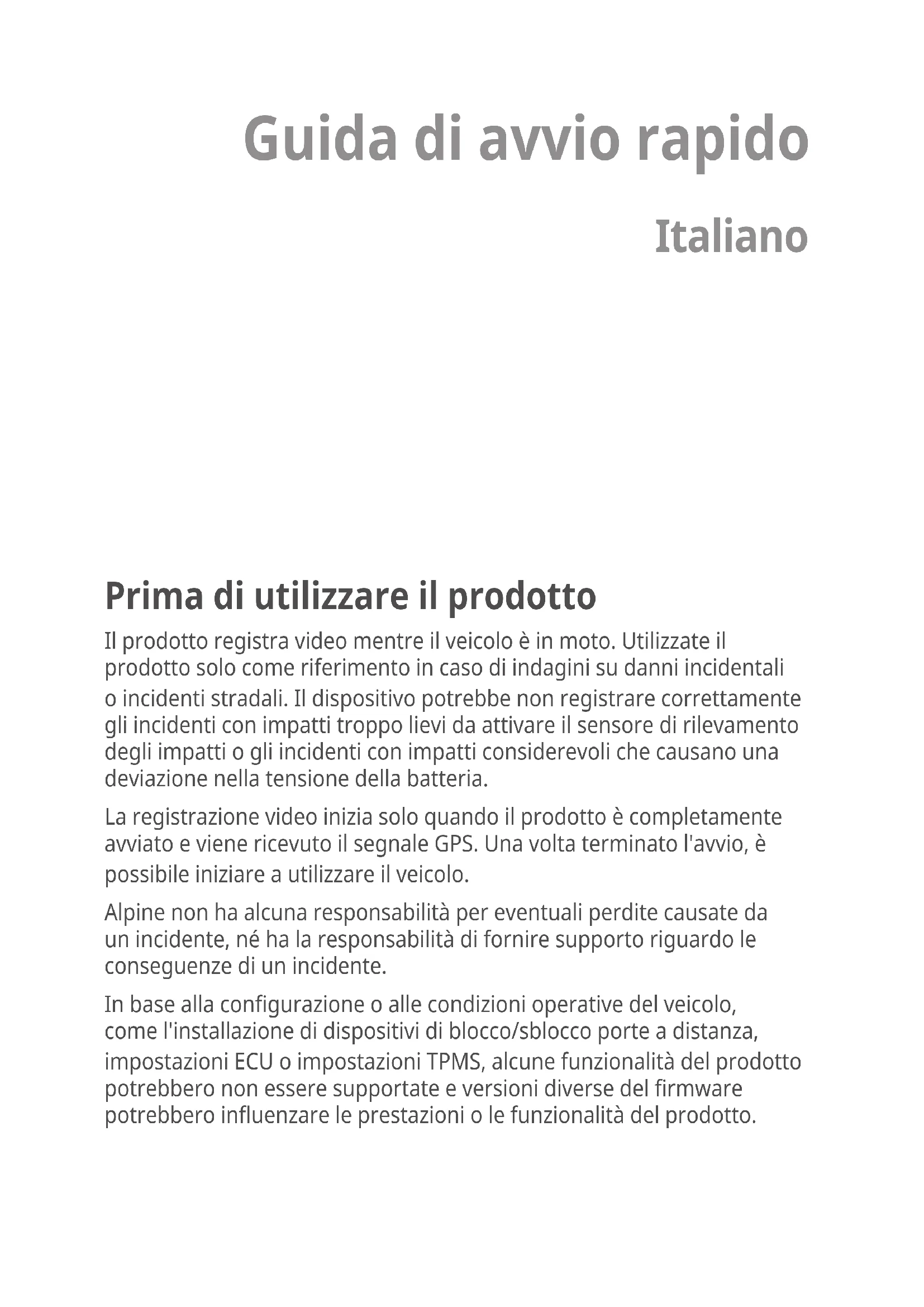 la pantalla y siga las instrucciones en la pantalla para conectar el producto con su smartphone. DVR-C310S,RVC-C310_EU_QSG.indb 75DVR-C310S,RVC-C310_EU_QSG.indb 75 2020-10-15 오후 5:17:422020-10-15 오후 5:17:4276 Por medio del presente, Alpine Electronics (Europa) declara que el tipo de equipo de radio DVR-C310S cumple con la Directiva 2014/53/EU. El texto completo de la declaración de conformidad de la UE se encuentra disponible en la siguiente dirección de Internet: http://www.alpine.com/e/ research/doc/ Información acerca del desecho de baterías y equipos eléctricos y electrónicos viejos (aplicable para los países que adoptaron sistemas de separación en la recolección de residuos) Si desea descartar este producto, no lo mezcle con los residuos domésticos generales. Existe un sistema de recolección separado que se utiliza para productos electrónicos, según con las disposiciones, que requiere el tratamiento, la recuperación y el reciclado apropiados. Comuníquese con la autoridad local para obtener información acerca de la instalación de reciclado más cercana. El reciclado y el desecho de residuos adecuados ayudarán a conservar los recursos y a evitar, al mismo tiempo, los efectos perjudiciales sobre nuestra salud y el medio ambiente. Wi-Fi (IEEE 802.11b/g/n) en la banda ISM de 2,4 GHz (2.412~2.472 MHz) Potencia máxima [17,99 dBm / 63 mW (EIRP)] Solo Rx: GNSS (1.563~1.610 MHz), GPS L1 (1.575,42 MHz) + GLONASS L1 (1.602,00 MHz) Información importante sobre el software Acerca de la licencia de software del producto El software instalado en el producto es de código abierto. Vea los siguientes sitios web de Alpine para obtener información acerca del software de código abierto. http://www.alpine.com/e/oss/download DVR-C310S,RVC-C310_EU_QSG.indb 76DVR-C310S,RVC-C310_EU_QSG.indb 76 2020-10-15 오후 5:17:422020-10-15 오후 5:17:42Guida di avvio rapido Italiano Prima di utilizzare il prodotto Il prodotto registra video mentre il veicolo è in moto. Utilizzate il prodotto solo come riferimento in caso di indagini su danni incidentali o incidenti stradali. Il dispositivo potrebbe non registrare correttamente gli incidenti con impatti troppo lievi da attivare il sensore di rilevamento degli impatti o gli incidenti con impatti considerevoli che causano una deviazione nella tensione della batteria. La registrazione video inizia solo quando il prodotto è completamente avviato e viene ricevuto il segnale GPS. Una volta terminato l'avvio, è possibile iniziare a utilizzare il veicolo. Alpine non ha alcuna responsabilità per eventuali perdite causate da un incidente, né ha la responsabilità di fornire supporto riguardo le conseguenze di un incidente. In base alla congurazione o alle condizioni operative del veicolo, come l'installazione di dispositivi di blocco/sblocco porte a distanza, impostazioni ECU o impostazioni TPMS, alcune funzionalità del prodotto potrebbero non essere supportate e versioni diverse del rmware potrebbero inuenzare le prestazioni o le funzionalità del prodotto. DVR-C310S,RVC-C310_EU_QSG.indb 77DVR-C310S,RVC-C310_EU_QSG.indb 77 2020-10-15 오후 5:17:422020-10-15 오후 5:17:4278 Istruzioni operative Punti da osservare per un utilizzo sicuro Leggete attentamente questo manuale prima di utilizzare i componenti dell'impianto. Contiene le istruzioni su come utilizzare il prodotto in modo sicuro ed ecace. Alpine non può essere ritenuta responsabile di problemi dovuti al mancato rispetto delle istruzioni contenute nel presente manuale. Il presente manuale utilizza vari pittogrammi che mostrano come utilizzare il prodotto in sicurezza e avvisano dei pericoli potenziali dovuti all'uso o a collegamenti e operazioni impropri. Di seguito viene illustrato il signicato di tali pittogrammi. È importante comprendere appieno il signicato di questi pittogrammi per poter utilizzare correttamente il presente manuale e il sistema. Simboli di sicurezza in questa guida “Avvertenza” - questo simbolo contraddistingue istruzioni importanti. Il mancato rispetto delle stesse può causare lesioni gravi o morte.“Attenzione” - questo simbolo contraddistingue istruzioni importanti. Il mancato rispetto delle stesse può causare lesioni o danni a cose.“Nota” - questo simbolo fornisce informazioni utili anché gli utenti sfruttino al meglio le funzionalità del prodotto. Informazioni di sicurezza per un uso corretto Guida e utilizzo del prodotto
