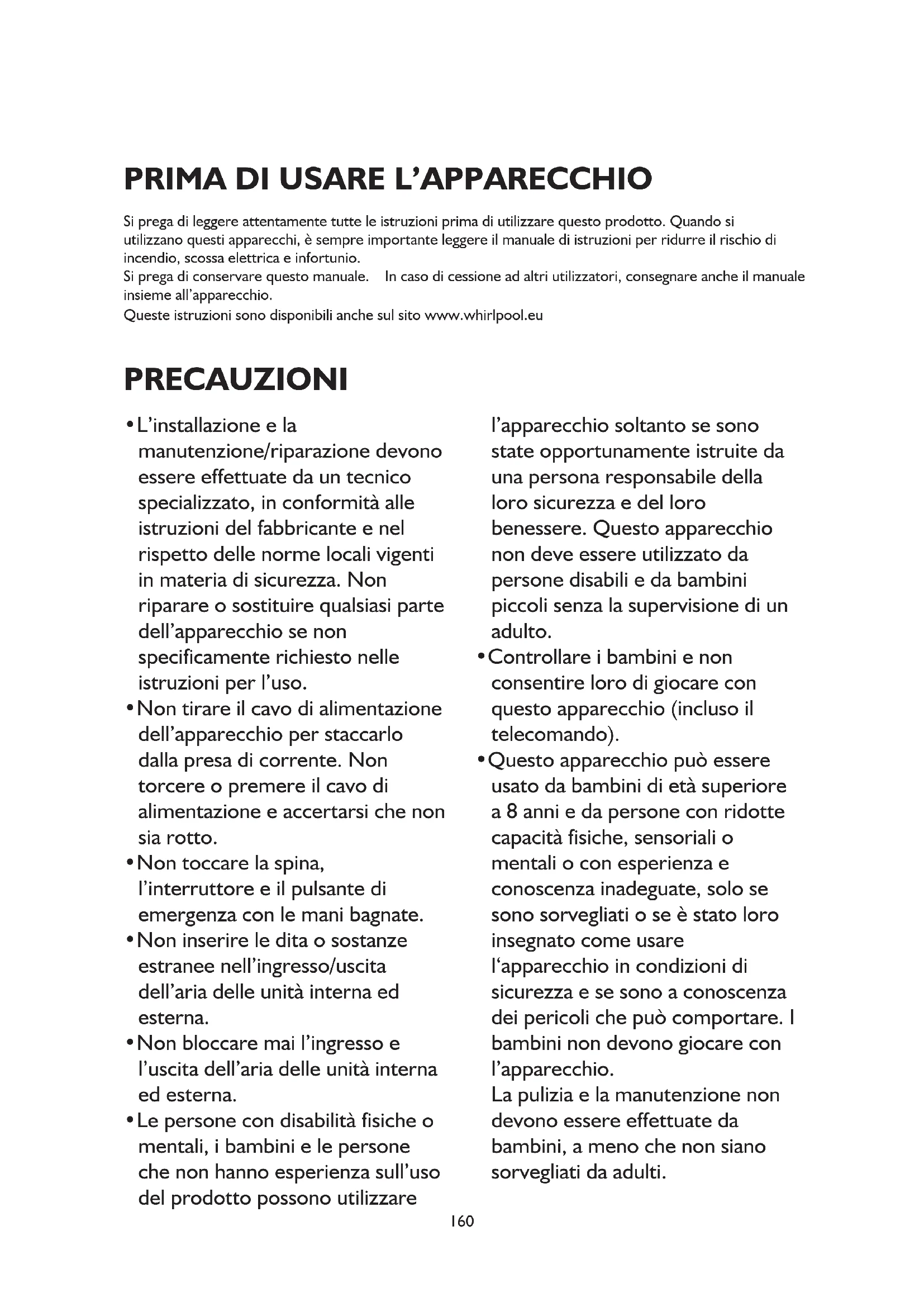 Si prega di leggere attentamente tutte le istruzioni prima di utilizzare questo prodotto. Quando si utilizzano questi apparecchi, è sempre importante leggere il manuale di istruzioni per ridurre il rischio di incendio, scossa elettrica e infortunio. Si prega di conservare questo manuale. In caso di cessione ad altri utilizzatori, consegnare anche il manuale insieme all’apparecchio. Queste istruzioni sono disponibili anche sul sito www.whirlpool.eu PRECAUZIONI