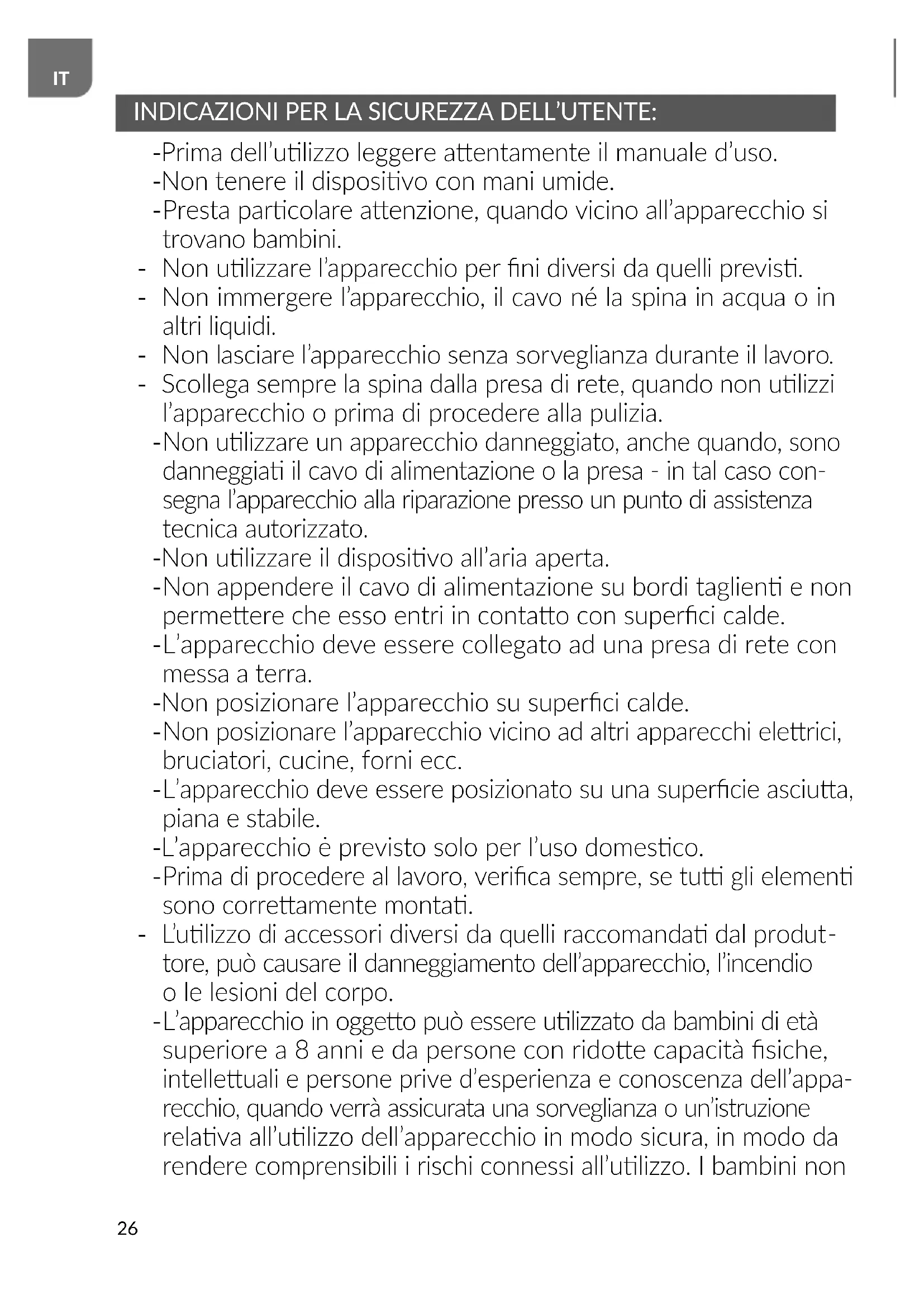 Presta parcolare aenzione, quando vicino all’apparecchio si trovano bambini. - Non ulizzare l’apparecchio per ni diversi da quelli previs. - Non immergere l’apparecchio, il cavo né la spina in acqua o in altri liquidi. - Non lasciare l’apparecchio senza sorveglianza durante il lavoro. - Scollega sempre la spina dalla presa di rete, quando non ulizzi l’apparecchio o prima di procedere alla pulizia.