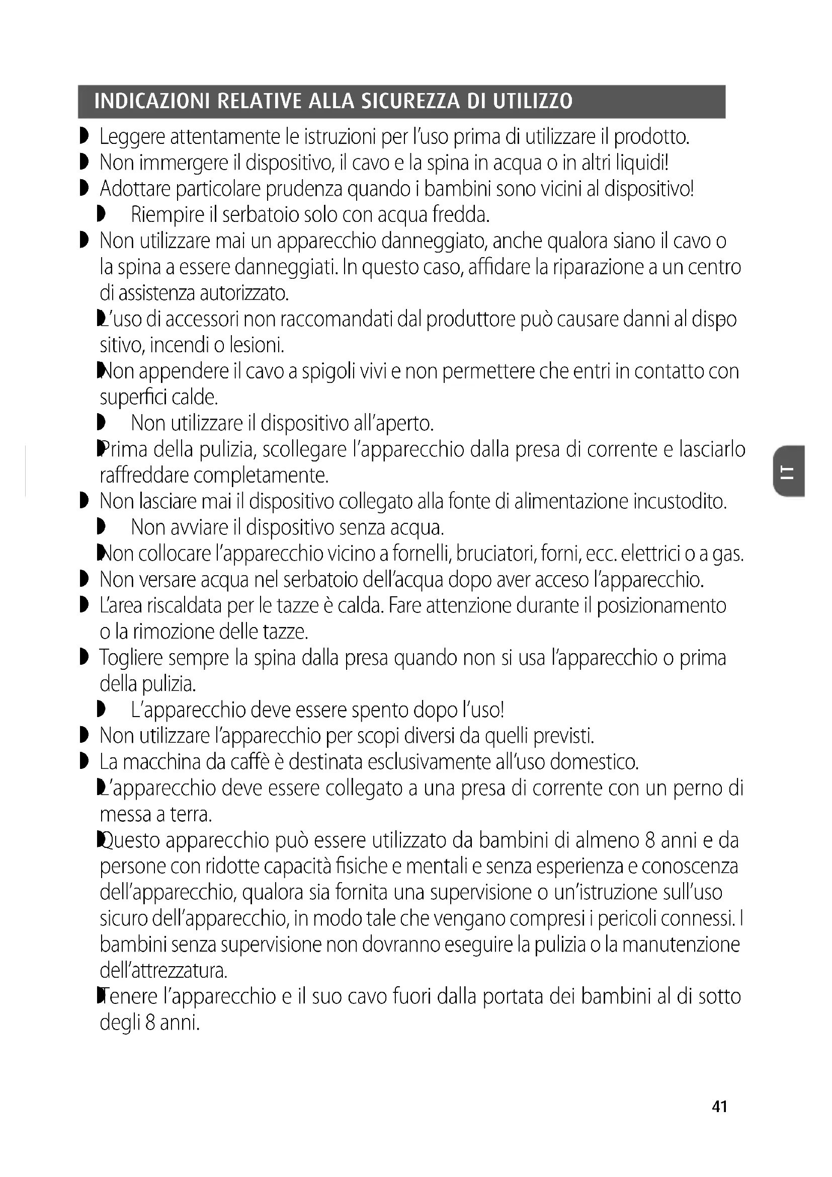 Non collocare l’apparecchio vicino a fornelli, bruciatori, forni, ecc. elettrici o a gas. Non versare acqua nel serbatoio dell’acqua dopo aver acceso l’apparecchio. L’area riscaldata per le tazze è calda. Fare attenzione durante il posizionamento o la rimozione delle tazze. Togliere sempre la spina dalla presa quando non si usa l’apparecchio o prima della pulizia. L’apparecchio deve essere spento dopo l’uso! Non utilizzare l’apparecchio per scopi diversi da quelli previsti. La macchina da caffè è destinata esclusivamente all’uso domestico.