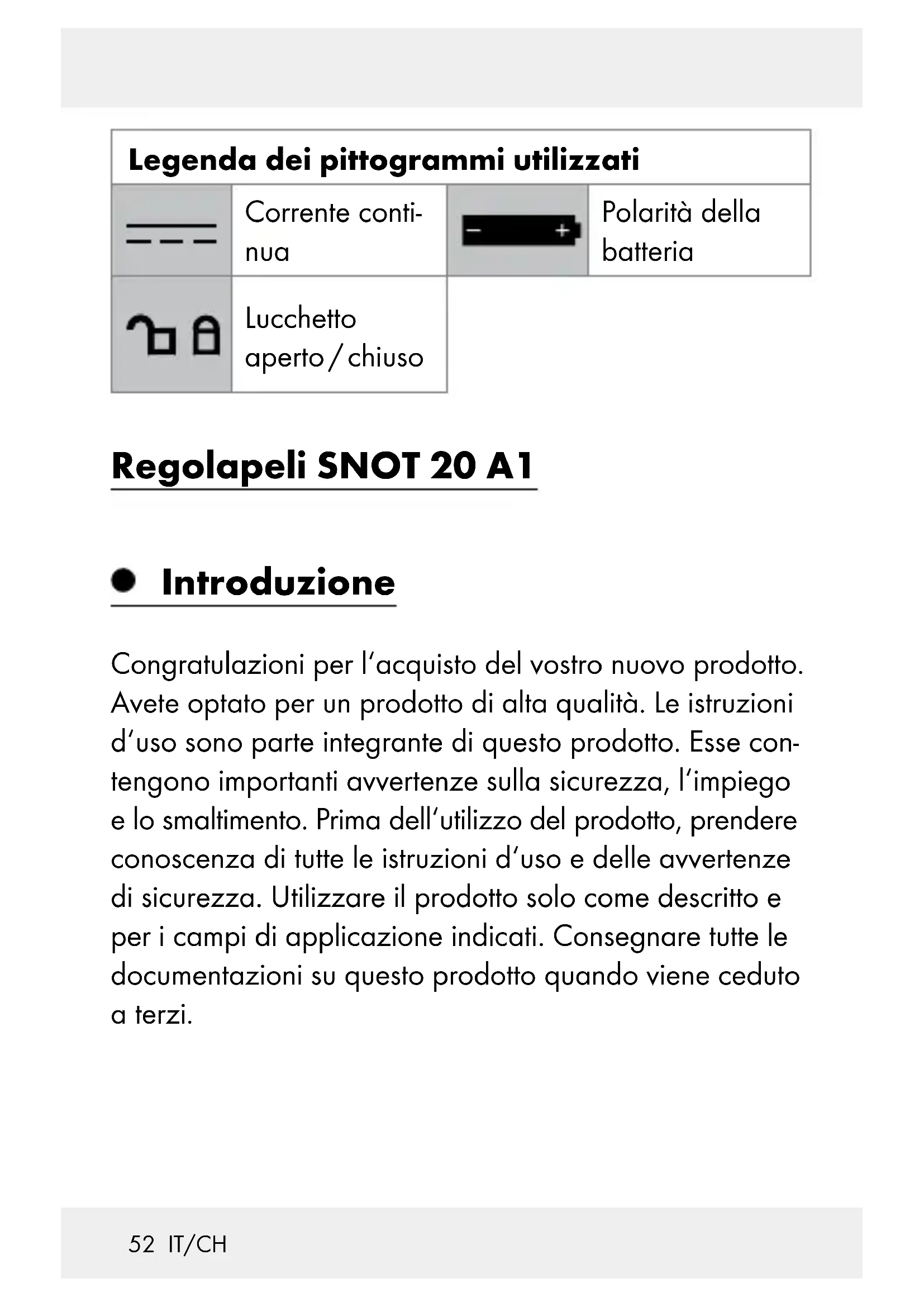IL FUTURO! ATTENZIONE! Questo prodotto non è un giocattolo per bambini! Te- nere il prodotto lontano dalla portata dei bambini. I bambini non possono riconoscere i pericoli causati dalla manipolazione di prodotti elettrici. Questo prodotto può essere usato da bambini a partire dagli 8 anni di età e da persone con capacità fisiche, sensoriali o mentali limitate, oppure senza esperienza e conoscenza in merito, qualora sorvegliati o istruiti circa un uso sicuro del prodotto e che56 IT/CH comprendano i pericoli ad esso con- nessi. I bambini non possono giocare con questo prodotto. La pulizia e la manutenzione non devono essere eseguite da bambini senza la super- visione di un adulto. Non utilizzare il prodotto se vi vengono riscontrati dei danni. Non esporre mai l’apparecchio ad alte temperature o a umidità, in quanto esso può subirne danni. Non esporre l’apparecchio ad urti o a sollecitazioni forti. In caso di danneggiamenti, di neces- sità di riparazione o di altri problemi, rivolgersi ad un elettricista. Proteggere il pro- dotto dall’umidità! Non immergere mai il prodotto in acqua.57 IT/CH Avvertenze di sicurezza per batterie / accumulatori PERICOLO DI MORTE! Tenere le batterie / gli accumulatori fuori dalla portata dei bambini. In caso di inge- rimento consultare subito un medico! PERICOLO DI ESPLOSIONE! Non ricaricare mai batterie non ricaricabili. Non cortocircuitare e / o aprire le batterie o gli accumulatori. Ne conseguirebbe un rischio di incendio, surriscaldamento o scoppio. Non gettare mai le batterie / gli accu- mulatori nel fuoco o in acqua. Non esercitare alcuna pressione meccanica sulle batterie / sugli accu- mulatori.58 IT/CH Rischio di perdita di liquido dalle batterie / dagli accumulatori Evitare condizioni e temperature estreme che possano ripercuotersi sulle batterie / sugli accumulatori, quali ad esempio la vicinanza a termosifoni o l‘irraggiamento solare diretto. Evitare il contatto delle sostanze chimi- che con la pelle, gli occhi e le mucose in caso di fuoriuscita del liquido dalle batterie! Sciacquare subito le aree colpite con acqua pulita e consultare immediatamente un medico!