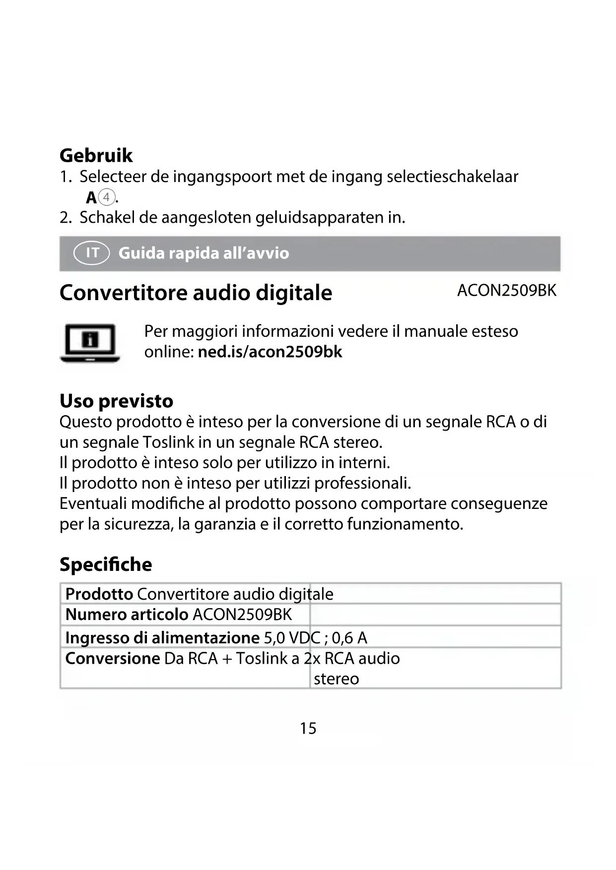 Guida rapida all’avvio Convertitore audio digitale ACON2509BK Per maggiori informazioni vedere il manuale esteso online: ned.is/acon2509bk Uso previsto Questo prodotto è inteso per la conversione di un segnale RCA o di un segnale Toslink in un segnale RCA stereo. Il prodotto è inteso solo per utilizzo in interni. Il prodotto non è inteso per utilizzi professionali. Eventuali modiche al prodotto possono comportare conseguenze per la sicurezza, la garanzia e il corretto funzionamento. Speciche Prodotto Convertitore audio digitale Numero articolo ACON2509BK Ingresso di alimentazione 5,0 VDC ; 0,6 A Conversione Da RCA + Toslink a 2x RCA audio stereo16 Formati supportati PCM Bitrate supportati 44.1 kHz 24 bit 48 kHz 24 bit 96 kHz 24 bit Parti principali (immagine A)
