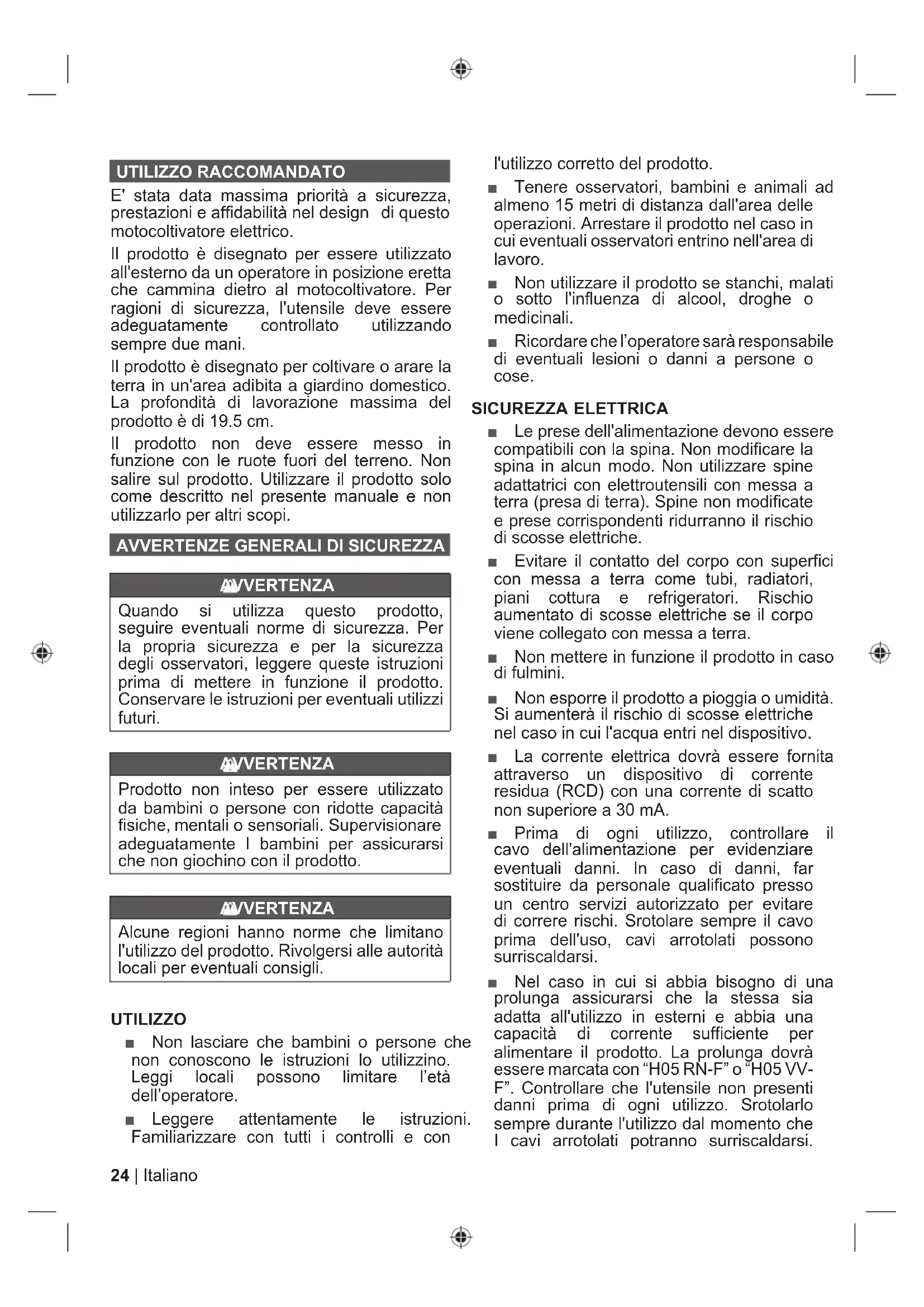 Conectar a la toma de corriente Desconectar de la toma de corriente Las piezas o accesorios se venden por separado OBSERVACIÓN: ADVERTENCIA24 | Italiano UTILIZZO RACCOMANDATO E' stata data massima priorità a sicurezza, SUHVWD]LRQLHDI¿GDELOLWjQHOGHVLJQ GLTXHVWR motocoltivatore elettrico. Il prodotto è disegnato per essere utilizzato all'esterno da un operatore in posizione eretta che cammina dietro al motocoltivatore. Per ragioni di sicurezza, l'utensile deve essere adeguatamente controllato utilizzando sempre due mani. Il prodotto è disegnato per coltivare o arare la terra in un'area adibita a giardino domestico. La profondità di lavorazione massima del prodotto è di 19.5 cm. Il prodotto non deve essere messo in funzione con le ruote fuori del terreno. Non salire sul prodotto. Utilizzare il prodotto solo come descritto nel presente manuale e non utilizzarlo per altri scopi.