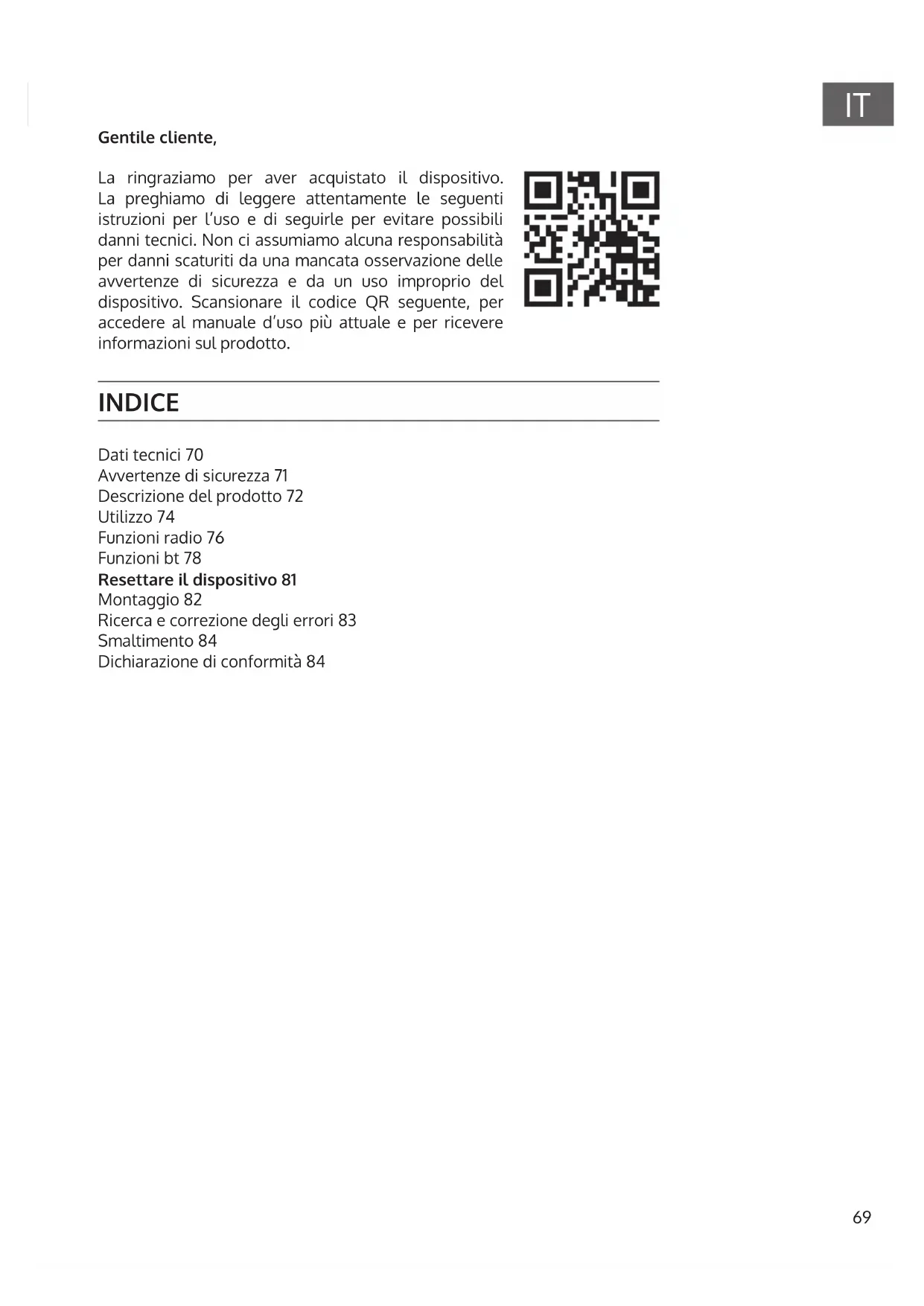 Gentile cliente, La ringraziamo per aver acquistato il dispositivo. La preghiamo di leggere attentamente le seguenti istruzioni per l’uso e di seguirle per evitare possibili danni tecnici. Non ci assumiamo alcuna responsabilità per danni scaturiti da una mancata osservazione delle avvertenze di sicurezza e da un uso improprio del dispositivo. Scansionare il codice QR seguente, per accedere al manuale d’uso più attuale e per ricevere informazioni sul prodotto. INDICE Dati tecnici 70 Avvertenze di sicurezza 71 Descrizione del prodotto 72 Utilizzo 74 Funzioni radio 76 Funzioni bt 78 Resettare il dispositivo 81 Montaggio 82 Ricerca e correzione degli errori 83 Smaltimento 84 Dichiarazione di conformità 8470