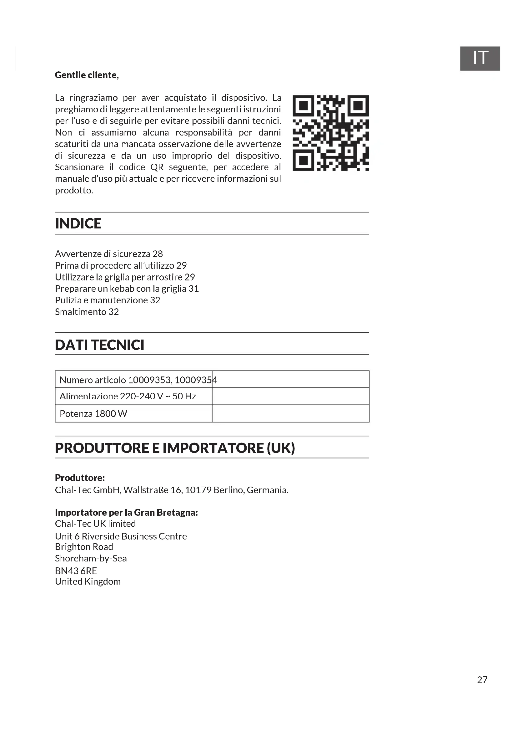 Gentile cliente, La ringraziamo per aver acquistato il dispositivo. La preghiamo di leggere attentamente le seguenti istruzioni per l’uso e di seguirle per evitare possibili danni tecnici. Non ci assumiamo alcuna responsabilità per danni scaturiti da una mancata osservazione delle avvertenze di sicurezza e da un uso improprio del dispositivo. Scansionare il codice QR seguente, per accedere al manuale d’uso più attuale e per ricevere informazioni sul prodotto. INDICE Avvertenze di sicurezza 28 Prima di procedere all’utilizzo 29 Utilizzare la griglia per arrostire 29 Preparare un kebab con la griglia 31 Pulizia e manutenzione 32 Smaltimento 32 DATI TECNICI Numero articolo 10009353, 10009354 Alimentazione 220-240 V ~ 50 Hz Potenza 1800 W PRODUTTORE E IMPORTATORE (UK) Produttore: Chal-Tec GmbH, Wallstraße 16, 10179 Berlino, Germania. Importatore per la Gran Bretagna: Chal-Tec UK limited Unit 6 Riverside Business Centre Brighton Road Shoreham-by-Sea BN43 6RE United Kingdom28