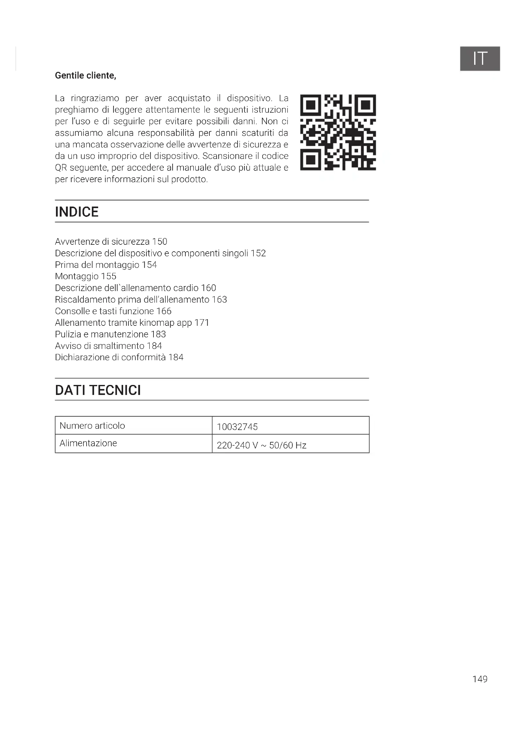 Gentile cliente, La ringraziamo per aver acquistato il dispositivo. La preghiamo di leggere attentamente le seguenti istruzioni per l’uso e di seguirle per evitare possibili danni. Non ci assumiamo alcuna responsabilità per danni scaturiti da una mancata osservazione delle avvertenze di sicurezza e da un uso improprio del dispositivo. Scansionare il codice QR seguente, per accedere al manuale d’uso più attuale e per ricevere informazioni sul prodotto. INDICE Avvertenze di sicurezza 150 Descrizione del dispositivo e componenti singoli 152 Prima del montaggio 154 Montaggio 155 Descrizione dell`allenamento cardio 160 Riscaldamento prima dell’allenamento 163 Consolle e tasti funzione 166 Allenamento tramite kinomap app 171 Pulizia e manutenzione 183 Avviso di smaltimento 184 Dichiarazione di conformità 184 DATI TECNICI Numero articolo